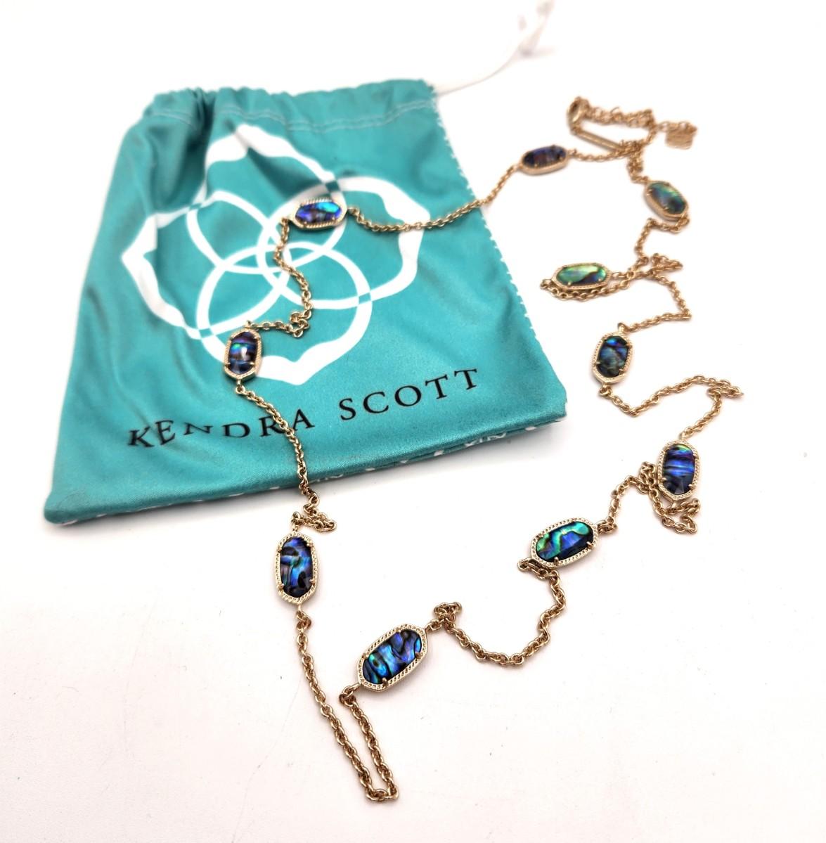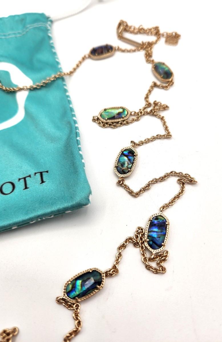 Very nice Kendra Scott gold-tone abalone necklace. Kendra Scott is known for quality costume jewelry - has original pouch. Adjustable - hangs about 20" at longest point. Good condition.
