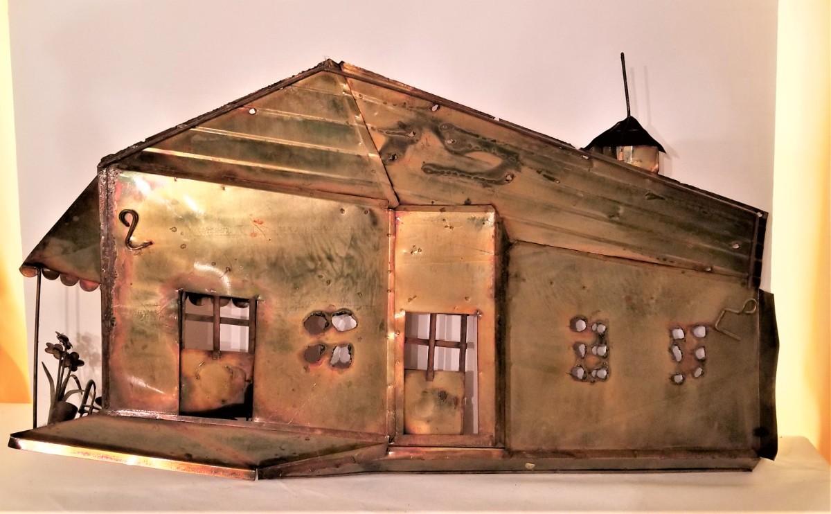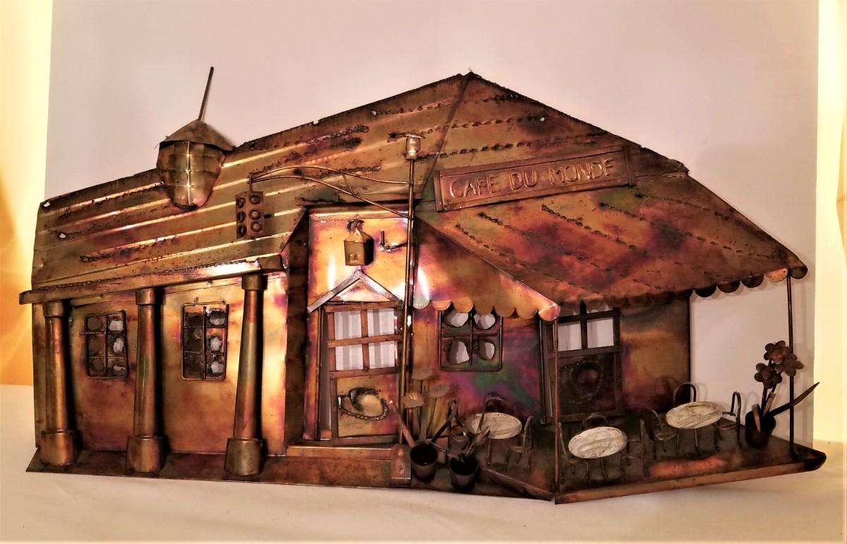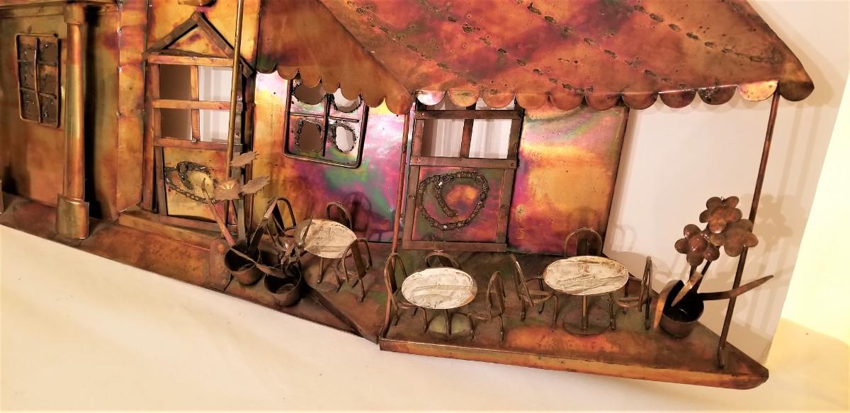 Note: check the measurements. This thing is bigger than it looks in the photo. Copper 1970's wall hanging depicting Cafe Du Monde. 2 dimensional. Good condition. 28.5" across, 16" tall. Has hooks on the reverse for hanging.