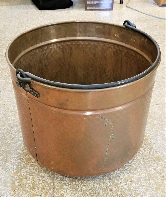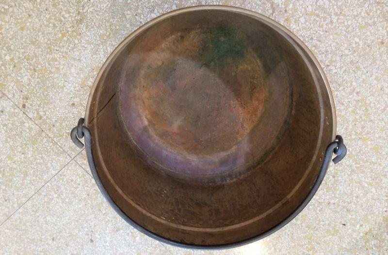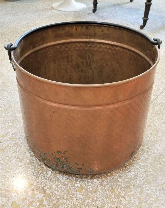 Large hammered copper kindling or log bucket with a wrought iron handle - nice and heavy. Measures 17" across and 14" tall. Has patina - could be brightly polished if you wish.