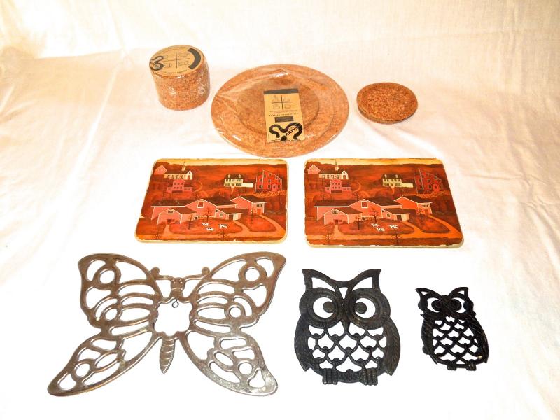 Pack of 24 cork coaster's by Arty's. 3 cork heat protectors, 2 country design paper over cork trivets, a 10" butterfly silver plated raised trivet and two metal owl trivets, 6" and 4". Two other framed ceramic tile trivets not pictured.