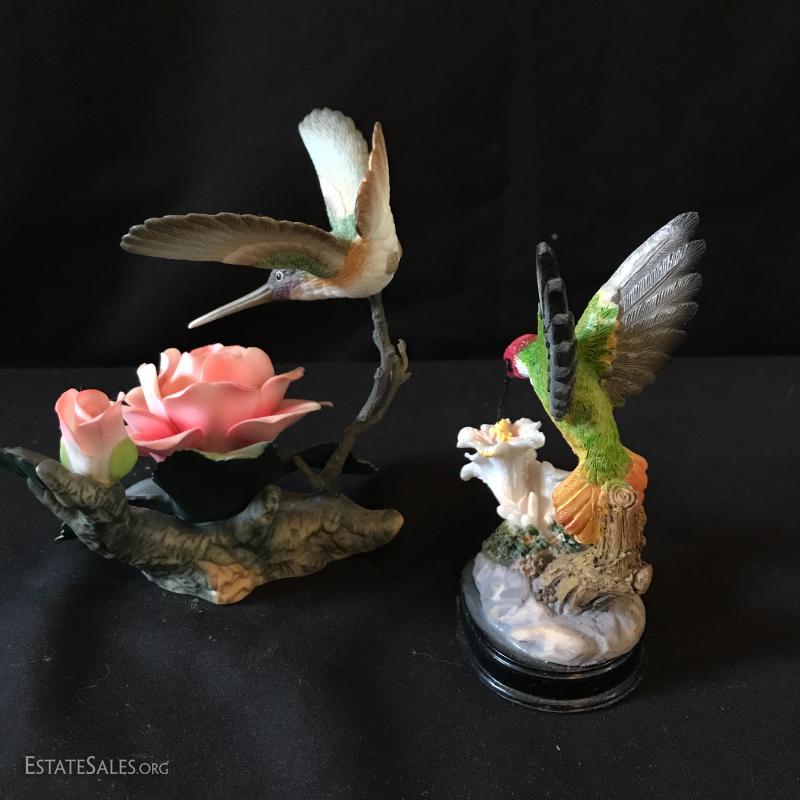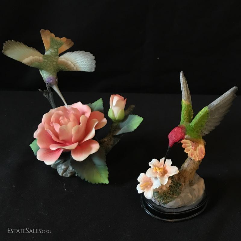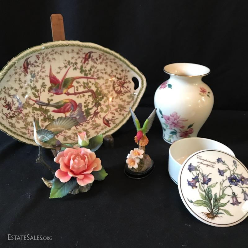 Beautiful floral and hummingbird pieces. Includes Villeroy & Boch dish with lid, Lenox Vase (6"tall), two hummingbird figurines (one marked Andrea by Sadek), and one serving platter with beautiful bird and floral design. See photos for details. Shipping available or local pick up in Flat Rock, NC.