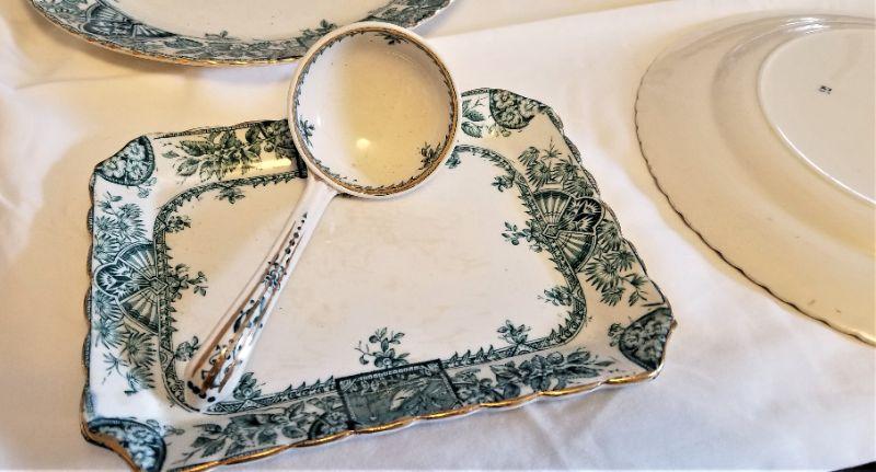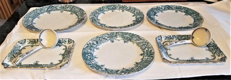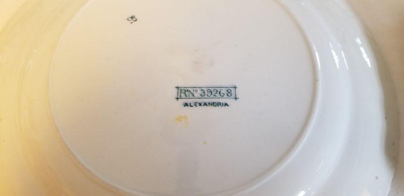 You get all you see here: 3 plates (each 9.25" across) - 2 small platters (each 8" x 6.25" - 1 Dinner plate (10" across - old chigger bite on the back) - 2 ladles - each 6.5" long). All are blue/white and in the Alexandrina patter. Registry mark dates the pieces to 1902. Purchased in England.
