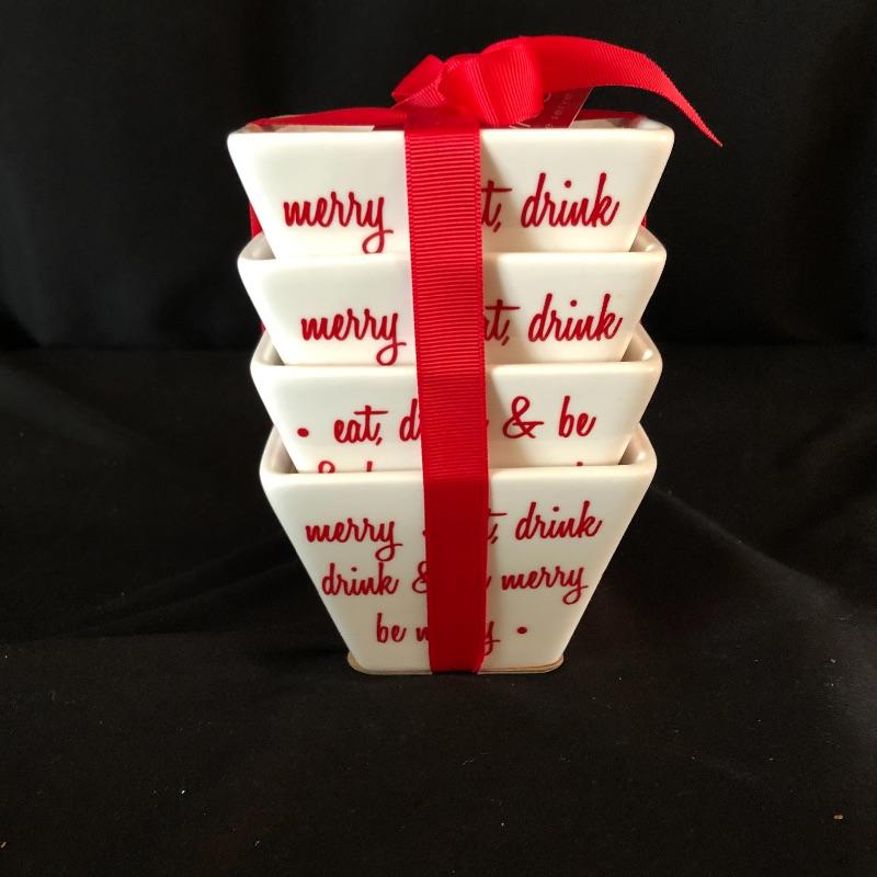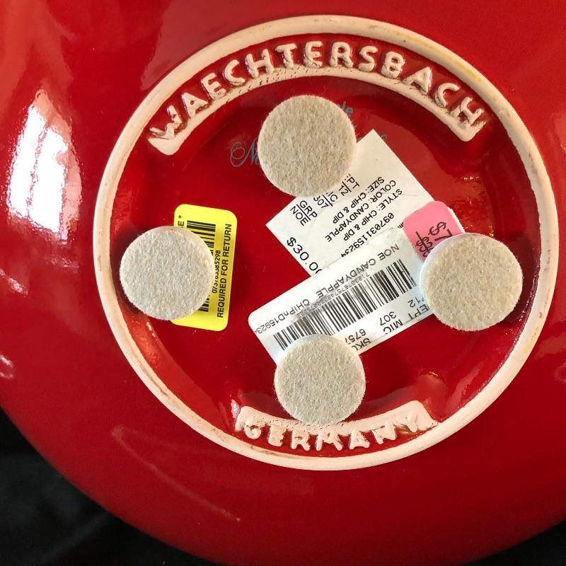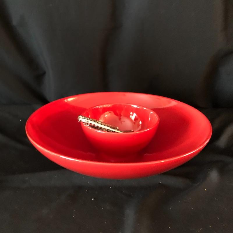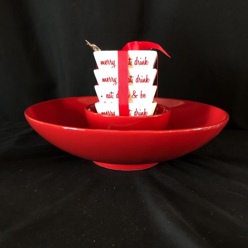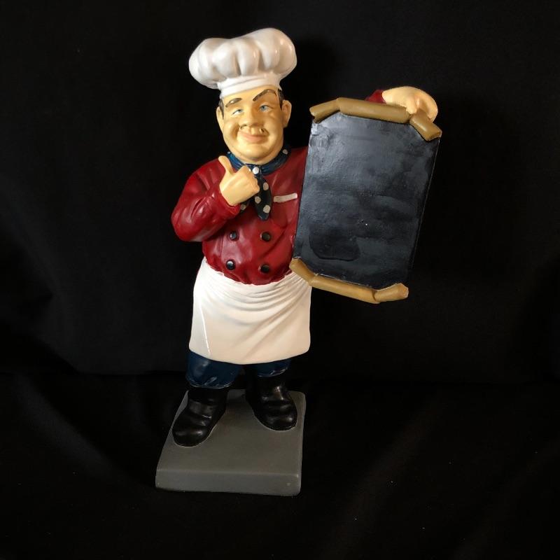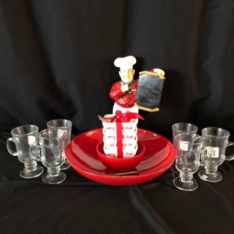 Lot includes Waechtersbach chip and dip bowl, four small bowls, six handled glasses and a chef figurine that appears to be resin. Bowl measures 12”D x 3.5” tall.