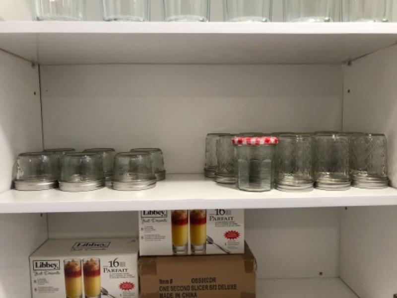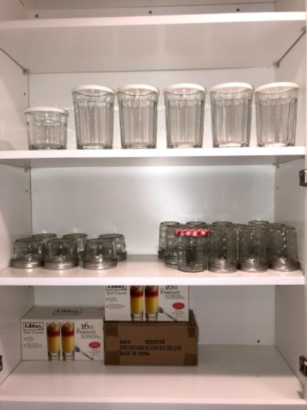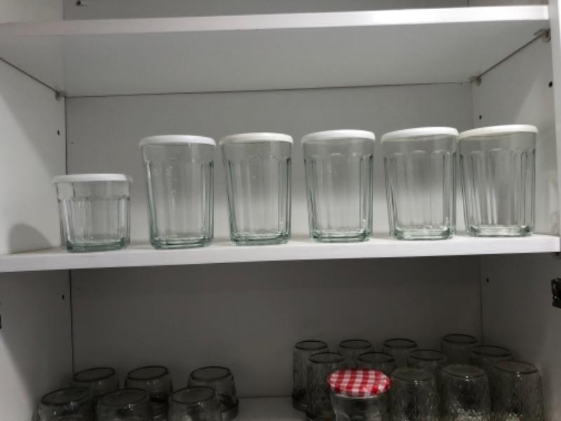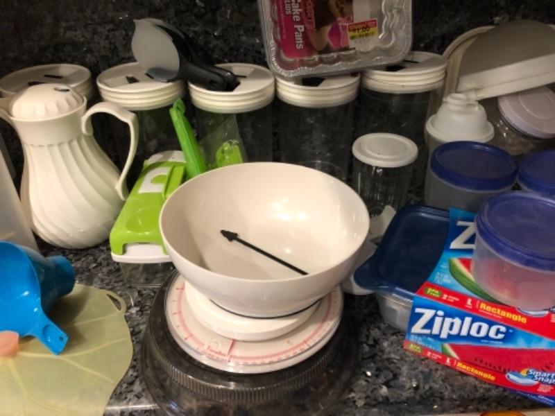 Lot 62. Plastic storage containers, water bottles, glassware, pitchers, plastic wine glasses, storage containers for cereals and dry goods, scale, food chopper, scoops, foil cake pans, Ball jar funnel, Ball jars w/lids, etc.--WAS $45““NOW $22.50