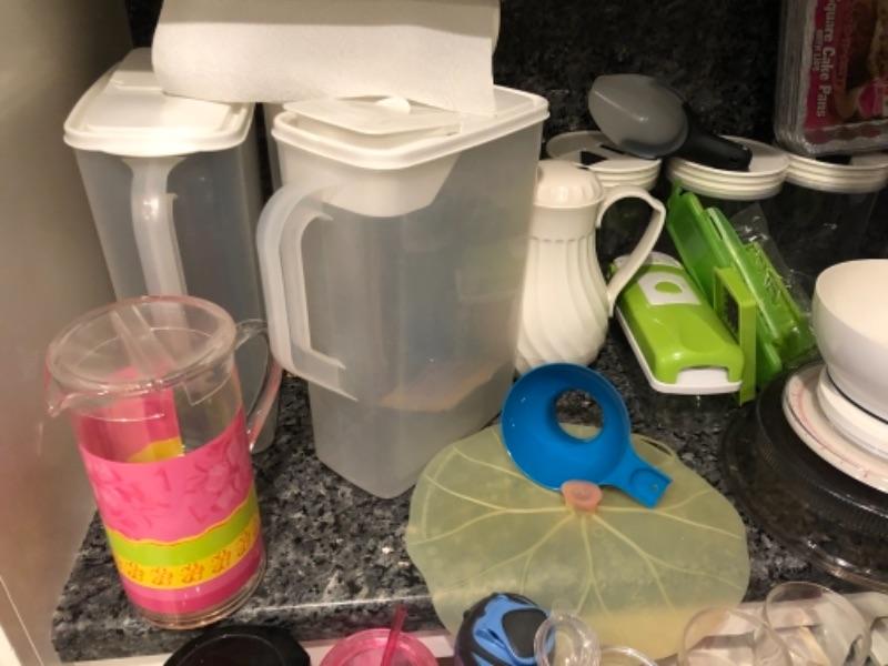 Lot 62. Plastic storage containers, water bottles, glassware, pitchers, plastic wine glasses, Ball jar funnel, Ball jars w/lids, etc.--WAS $45““NOW $22.50