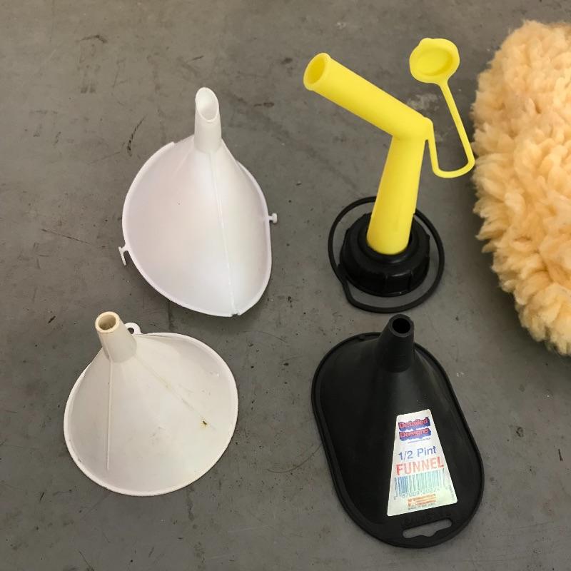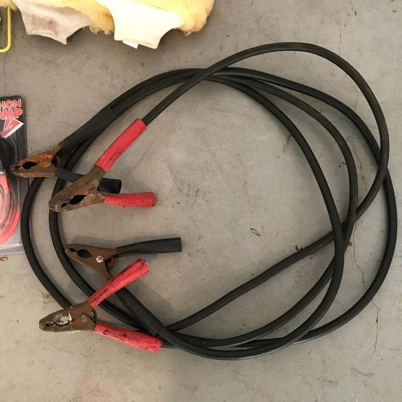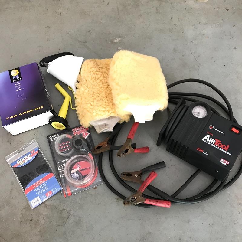 Air Tool high performance compressor perfect for tires and sports balls! Lot also includes other necessities to keep your automobile in great shape. Car shams, oil funnels, gas can spout and siphon pump along with high quality cleaning set. We cannot verify contents of cleaning bottles, but they appear very lightly used. The jumper cables have rust, but also appear very sturdy and in good working order. No shipping.