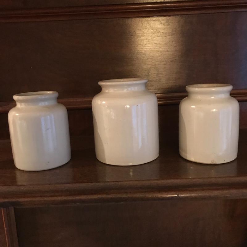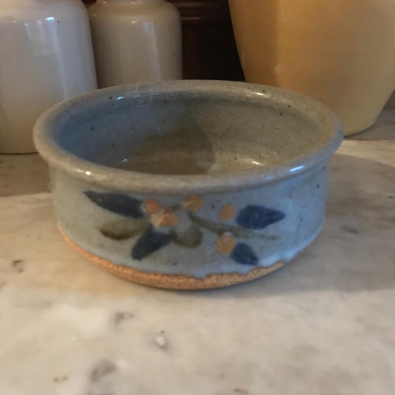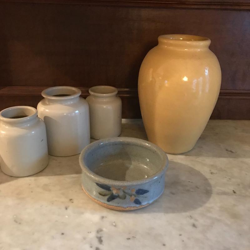 Three matching pieces of pottery, as well as and a 9” yellow vase. Small grey with floral detail dish also in lot. This lot is available for shipping or local pick up in Flat Rock, NC.