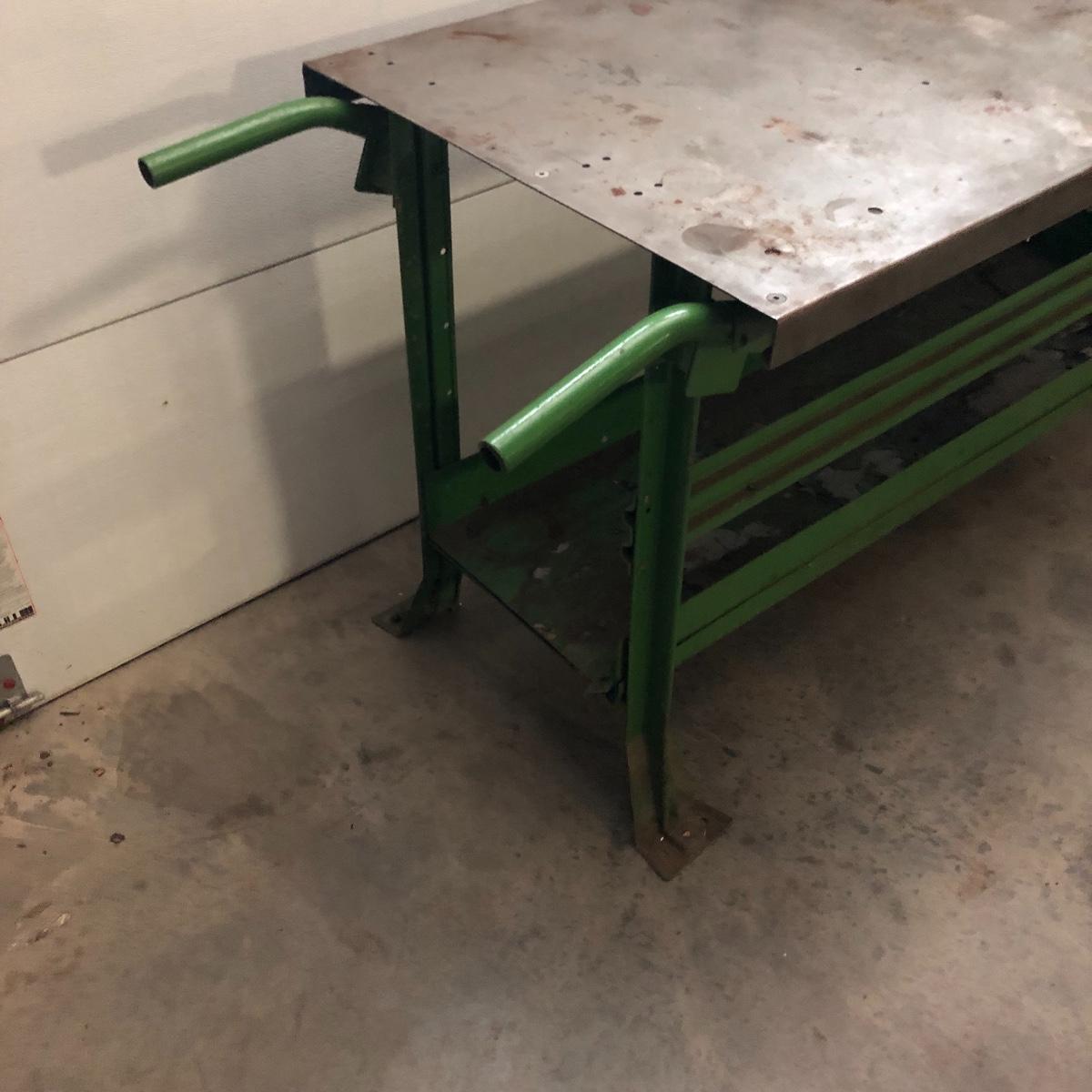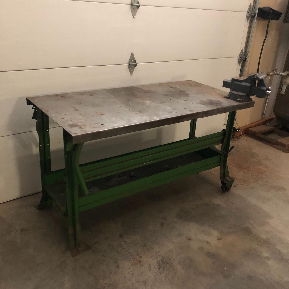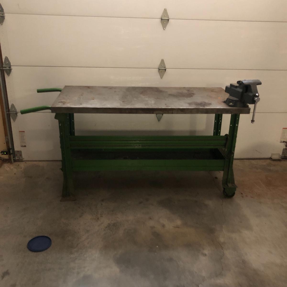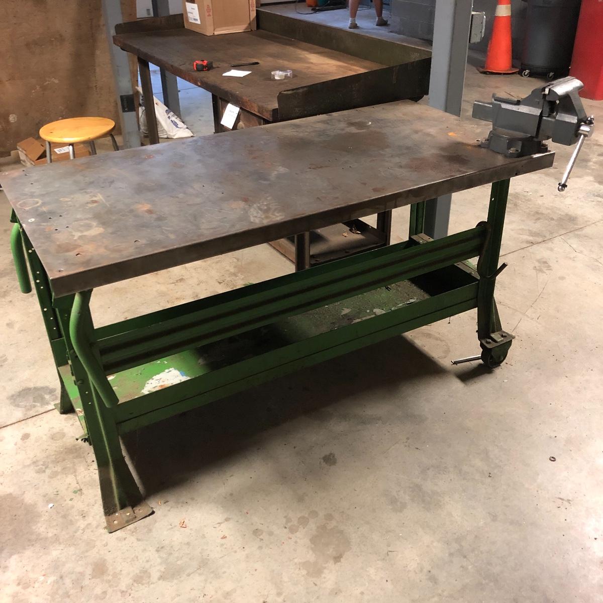 This industrial table has two wheels and folding handles that make it easy to move around. The table has a Craftsman vise attached and a steel top with a steel shelf underneath. This table will be great in your kitchen or workshop with its great industrial feel. Table measures 29” x 60” x 33.5”. Bring help item is substantial.