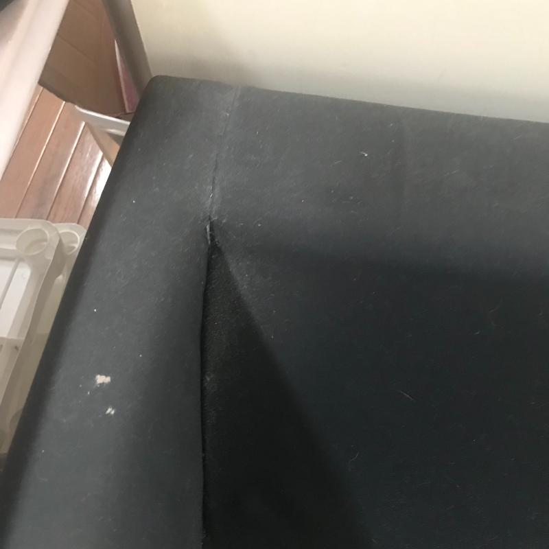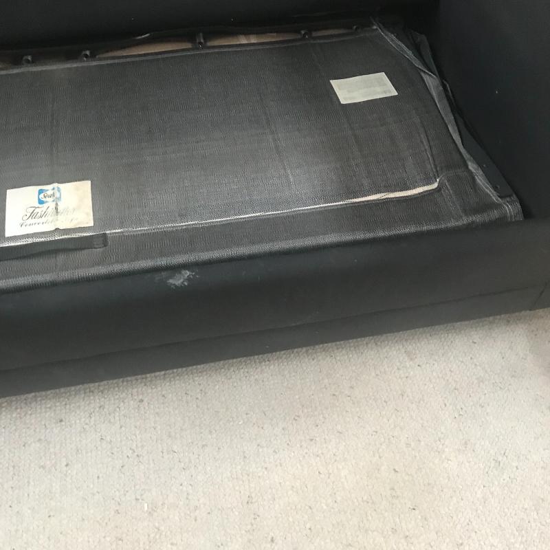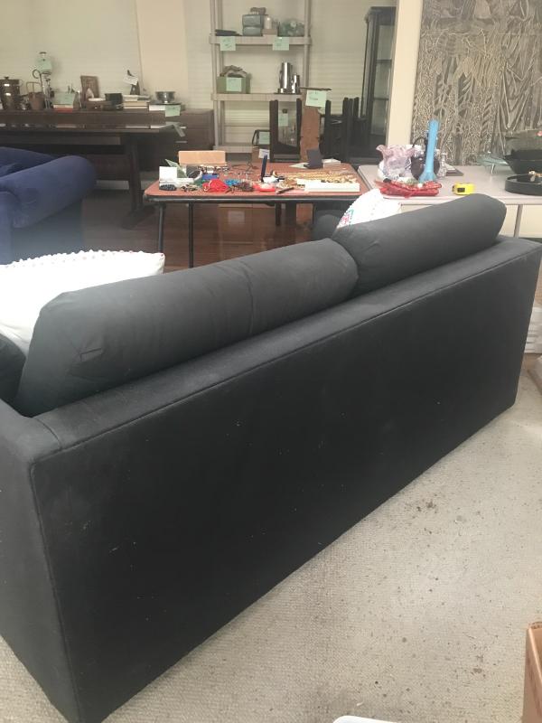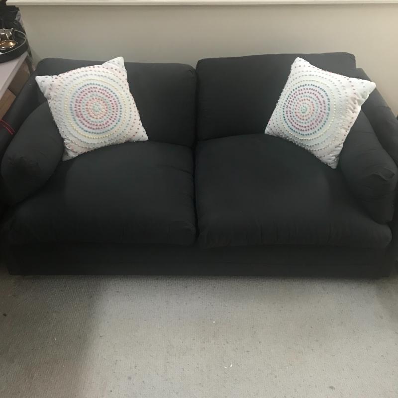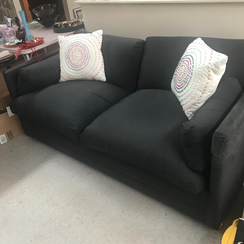 Black Cotton fabric sofa with removable cushions to reveal a full size pull out bed. You will need help loading this piece. Overall good condition. Includes two throw pillows. Piece measures 75” x34” x24”. Local pick up only.