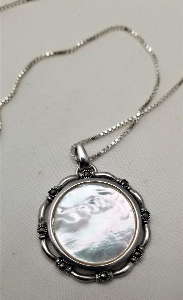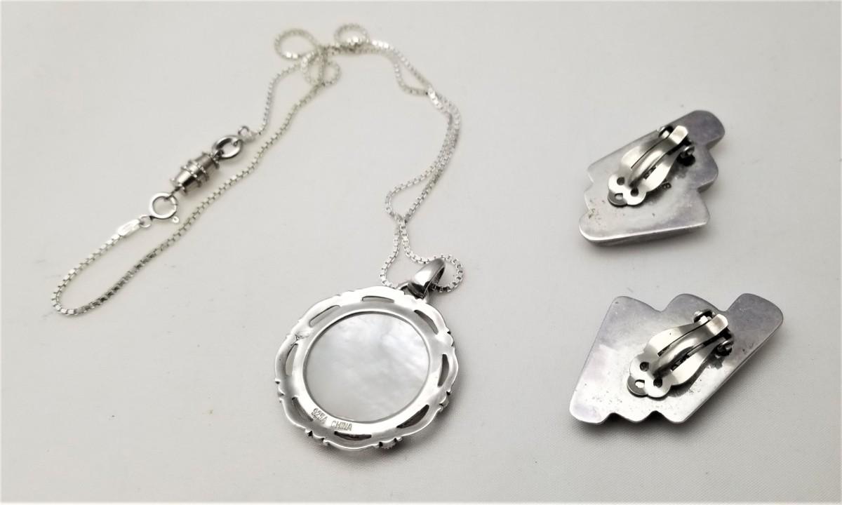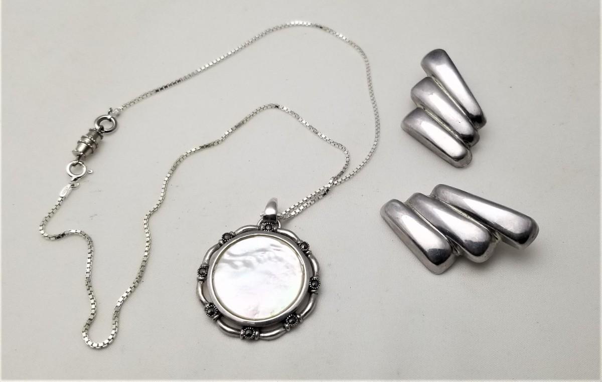 Nice Sterling Silver and Mother of Pearl necklace - box chain is 18" long and a heavy pair of Mexican Sterling (marked) clip earrings (contemporary styling). Earrings 1.5" long. Both in good condition.