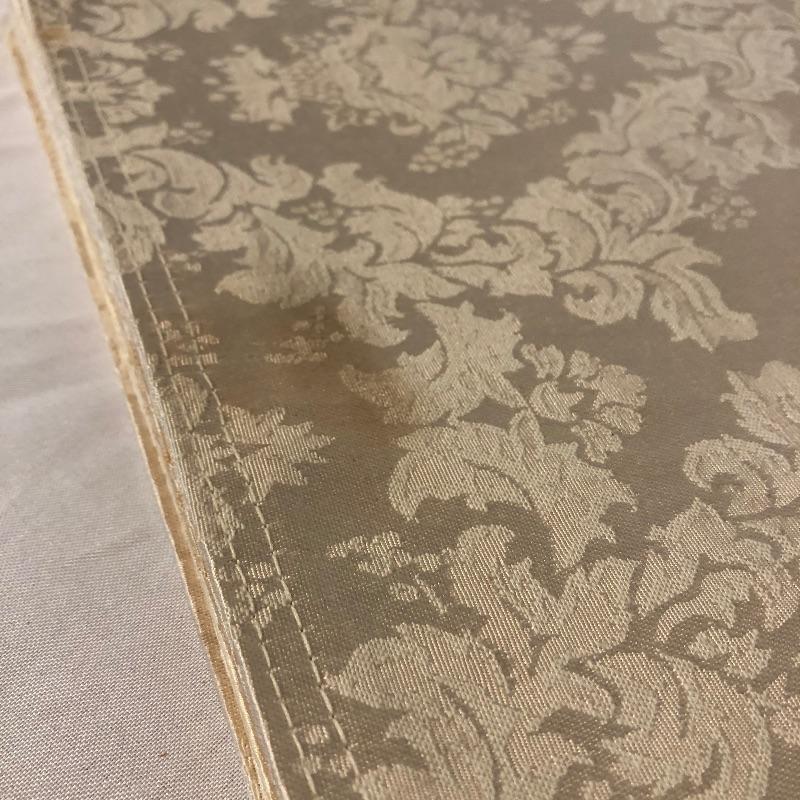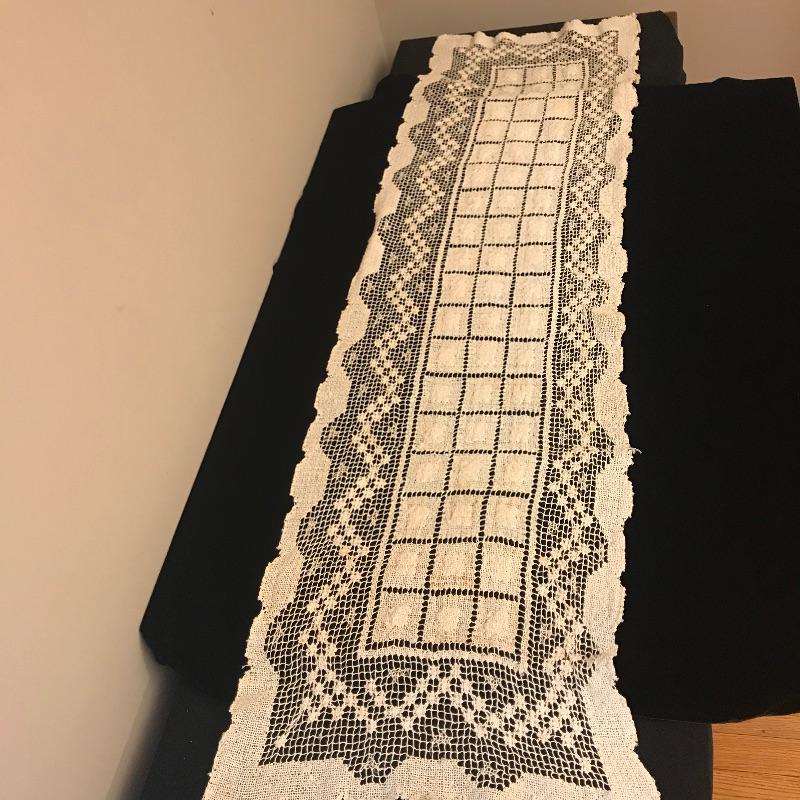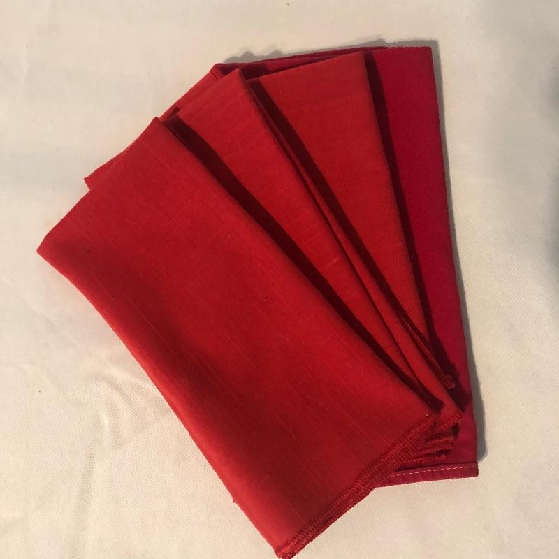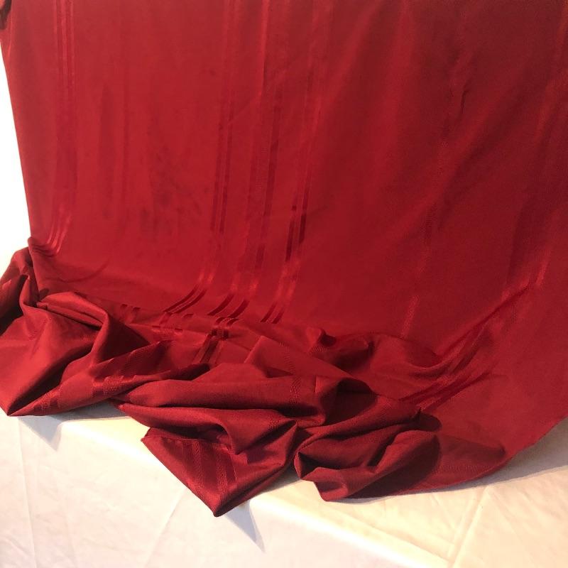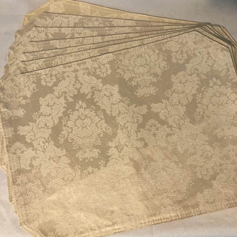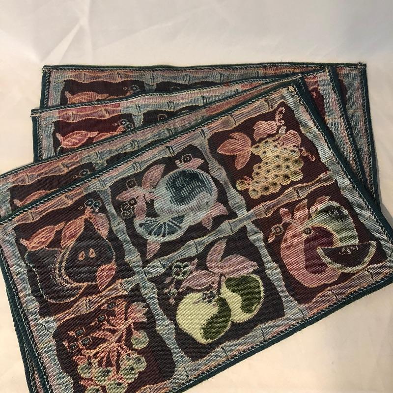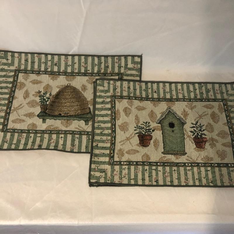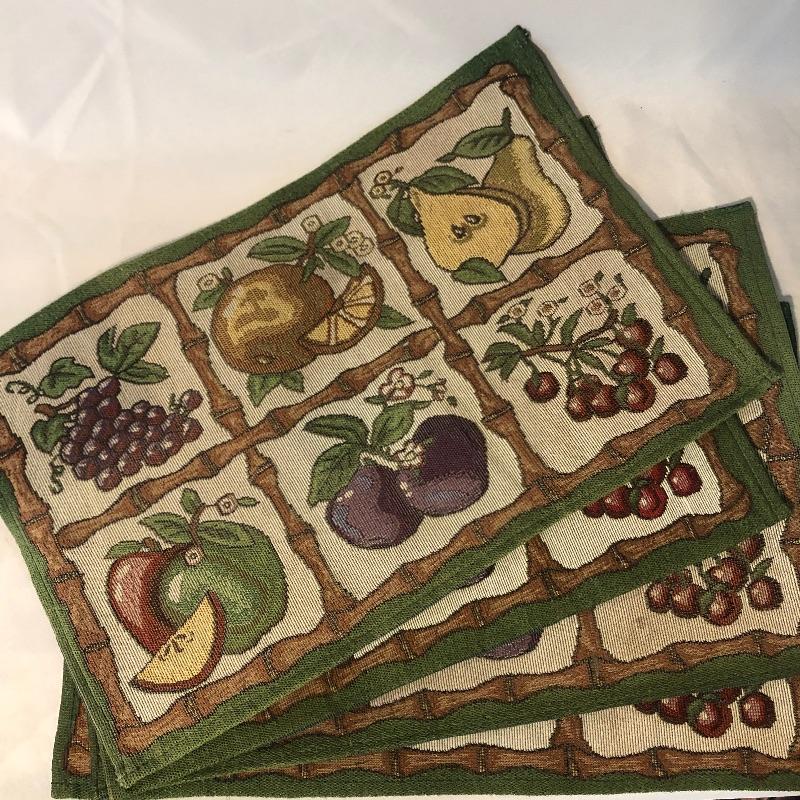 pieces have small stains. There are four red dinner napkins, one is of a slightly different hue. There is a 5’ x 7’ ribbed burgundy tablecloth with some minor grease stains. There are a total of fifteen placemats. Seven octagonal floral off-white (one has a slightly different design that the others), four green striped birdhouse/beehive rectangular mats and four green with fruit images. All placemats are in good condition with some small stains on one of the white. We’ve added a last minute addition of an ivory 4’ runner with minor wear. Shipping available.