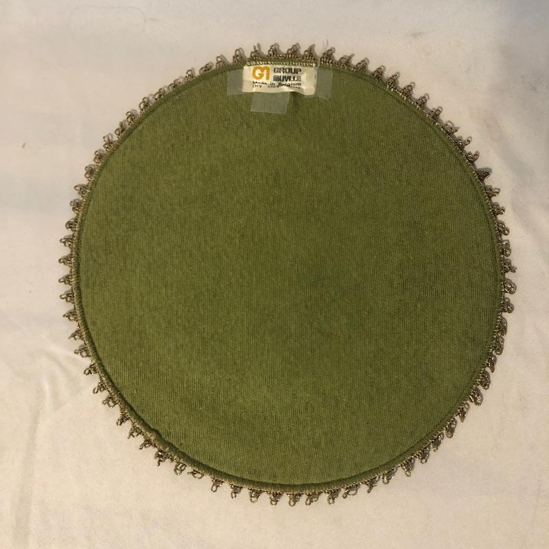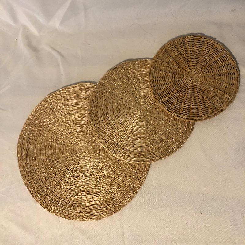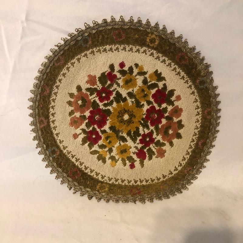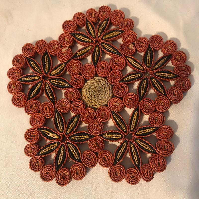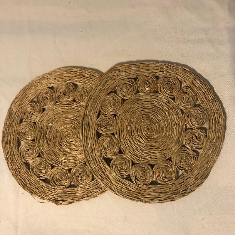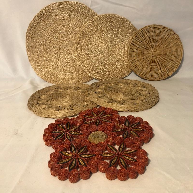 This lot meets your table dressing needs. Includes twelve trivets ranging from wood, to woven, to stitched to cloth. The largest of the trivets, the beautifully designed wooden piece, is 14” d. Some