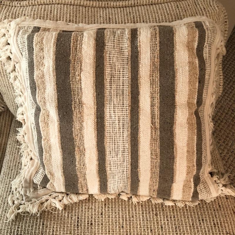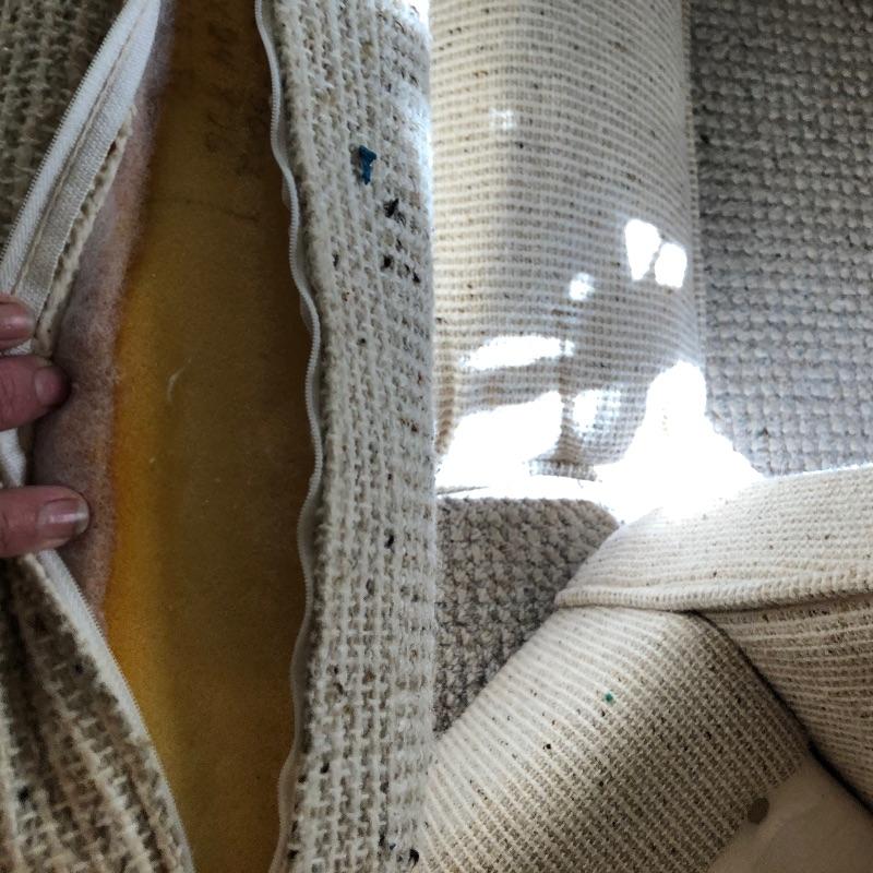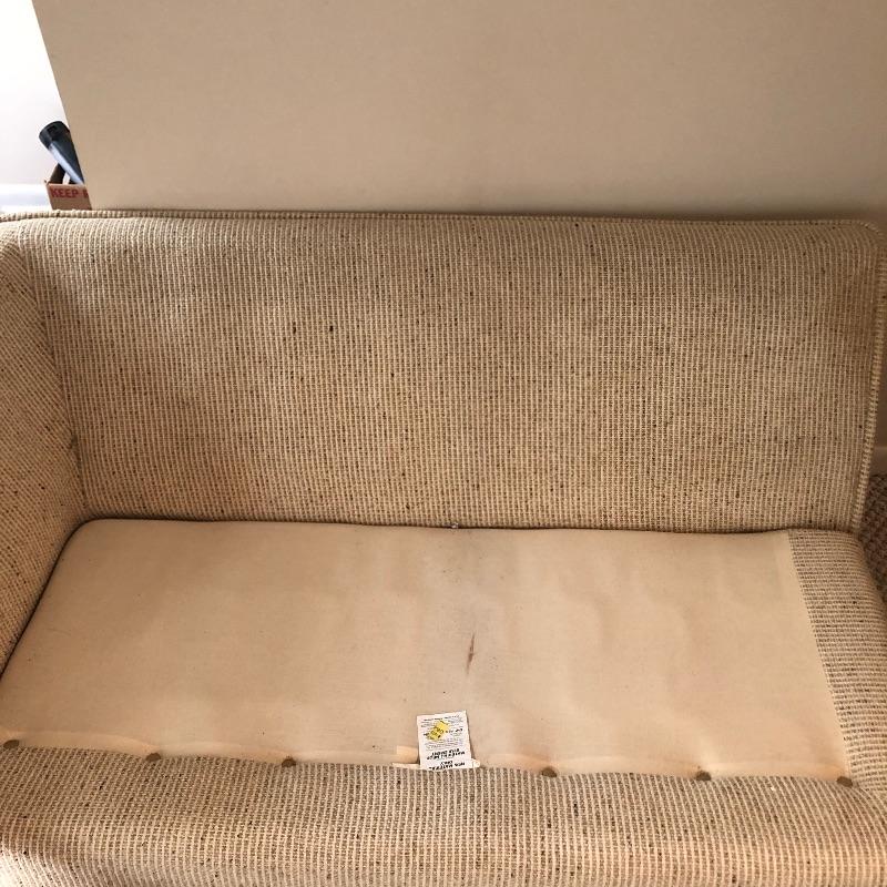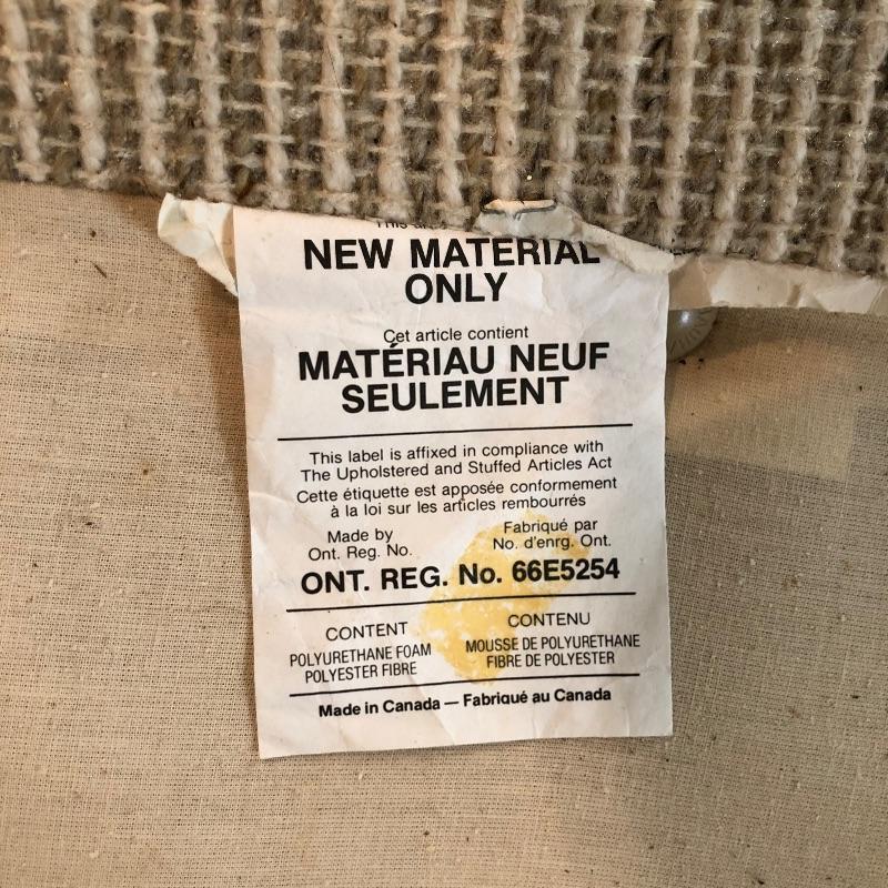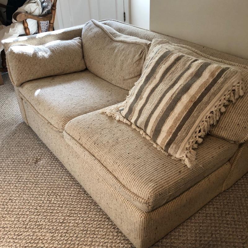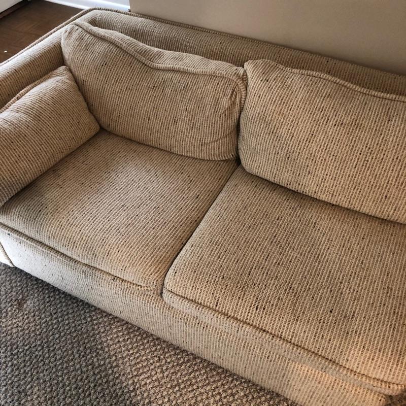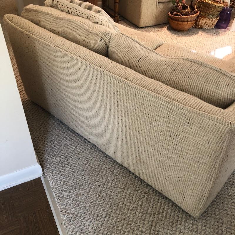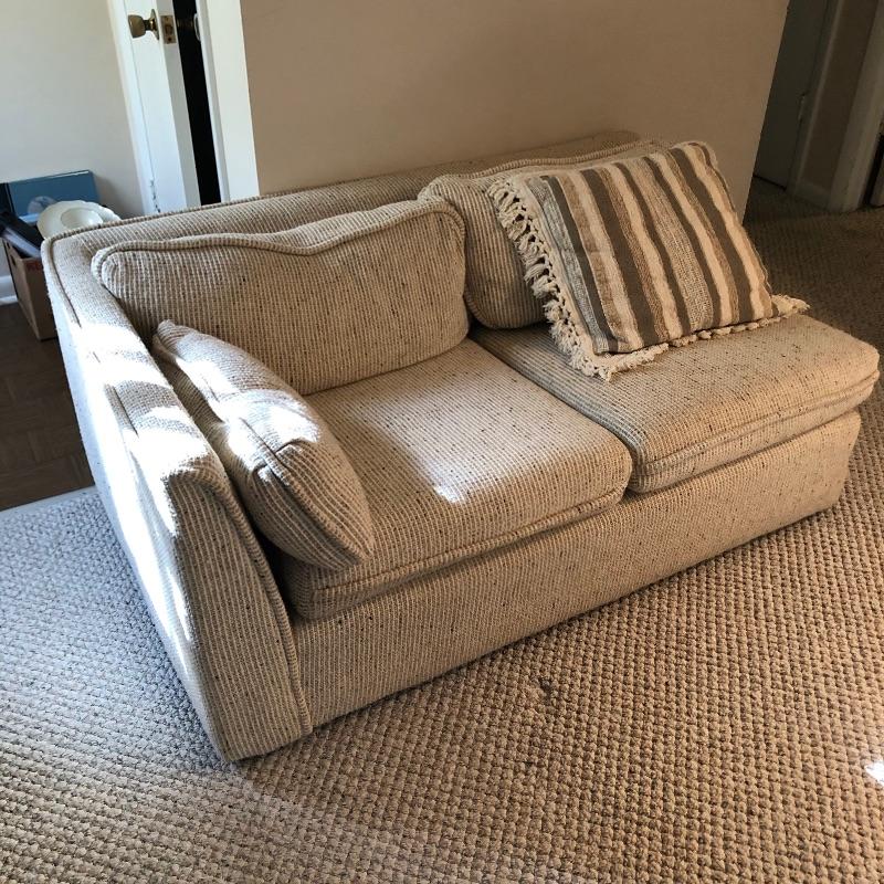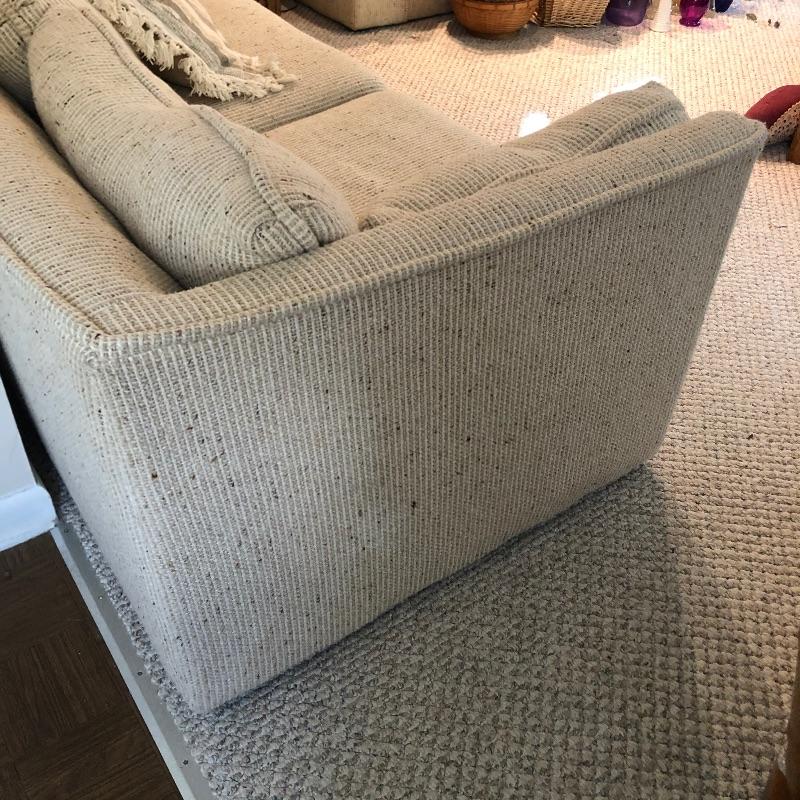 This well cared for and extremely comfortable love seat matches the sofa in Lot 59 (the one open end matches up to the sofa making it an L-shaped sectional). Seat and pillow covers have zippers, so they can be washed. Comes with one throw pillow. Is a cream color with dark colored specs. Has an armrest on only one side.