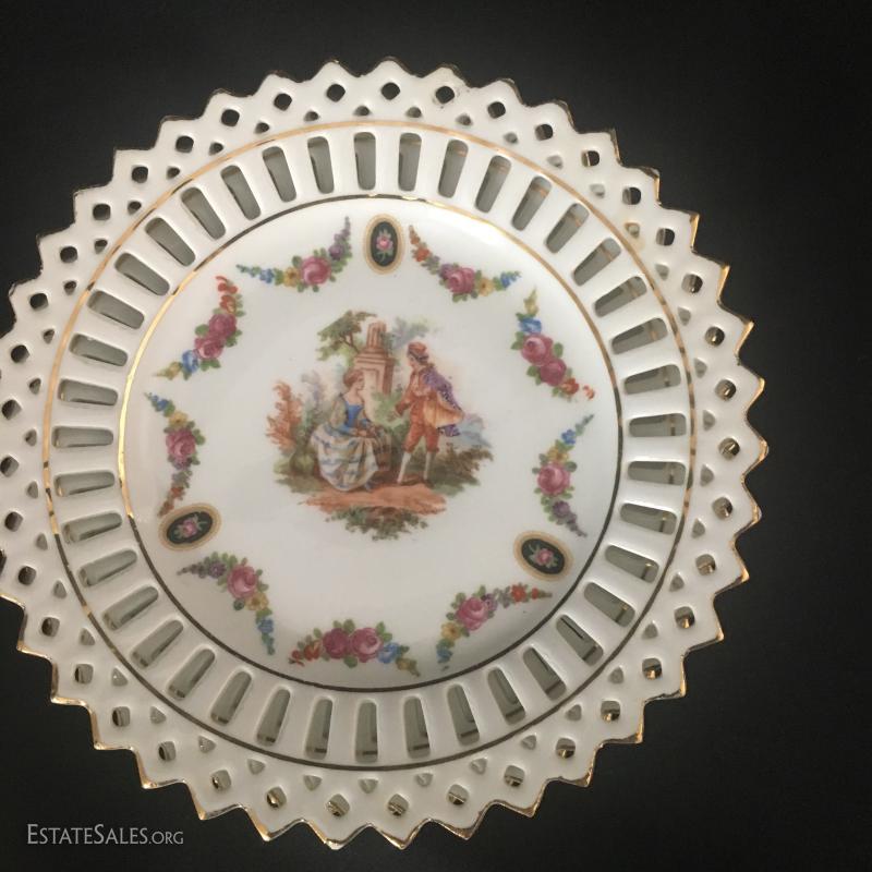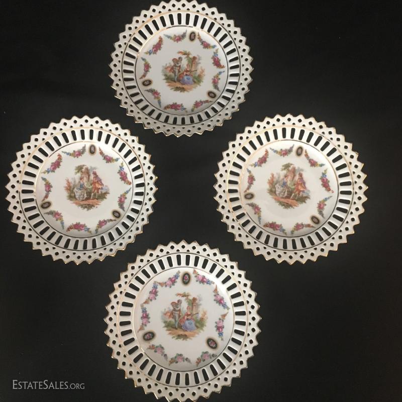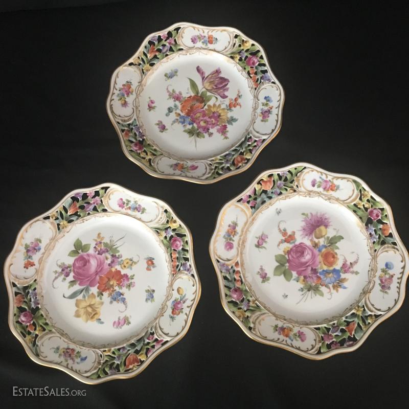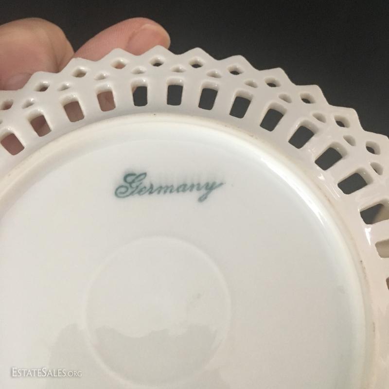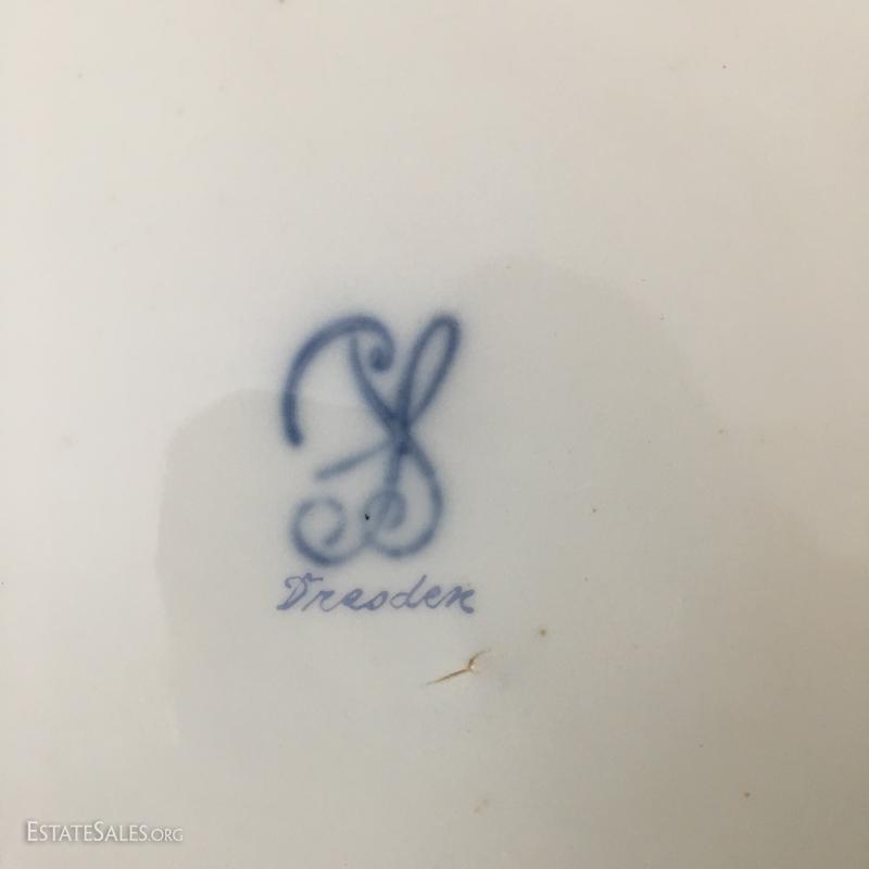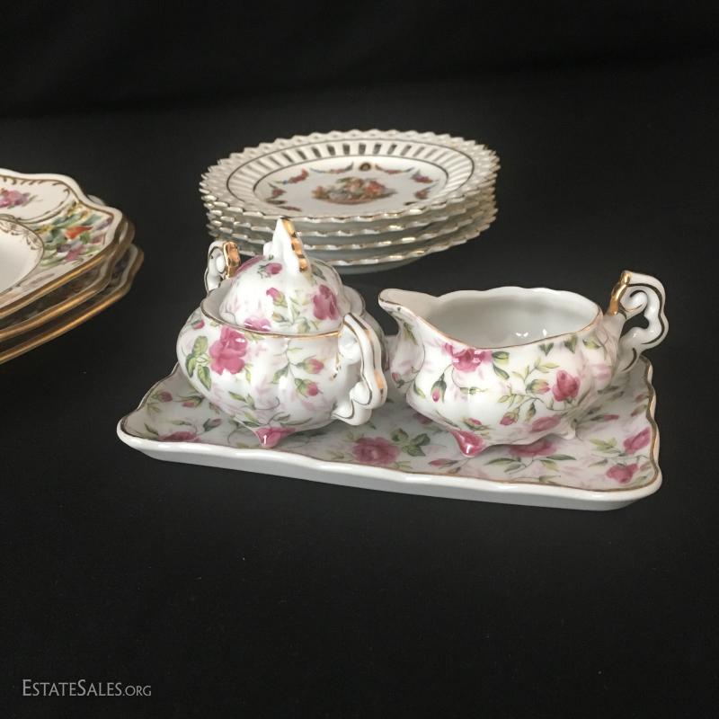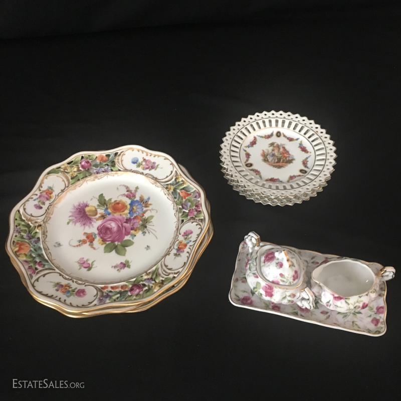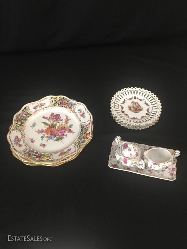 Small cream and sugar on rectangle platter, 4 small German plates and 3 Dresden china plates. This lot is avaiable for shipping or local pick up in asheville, NC.