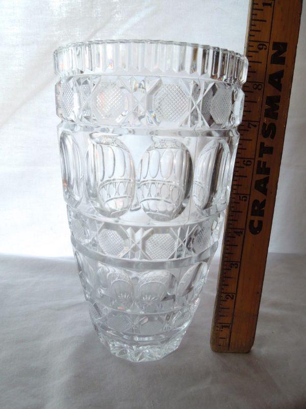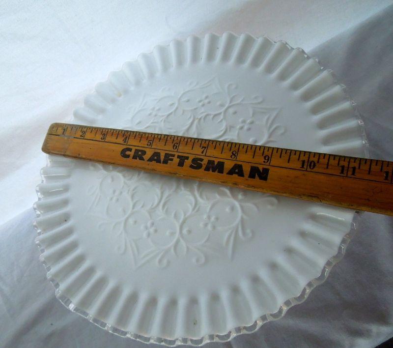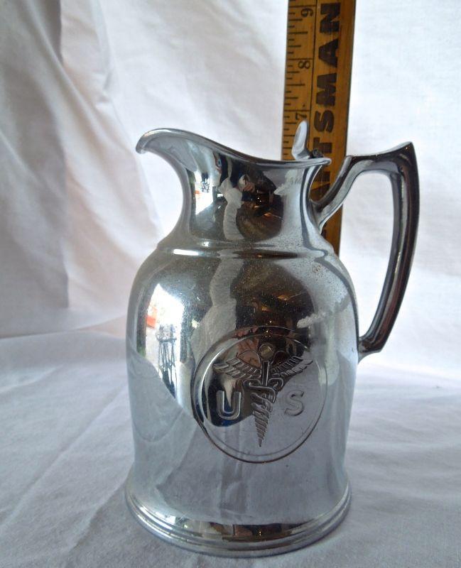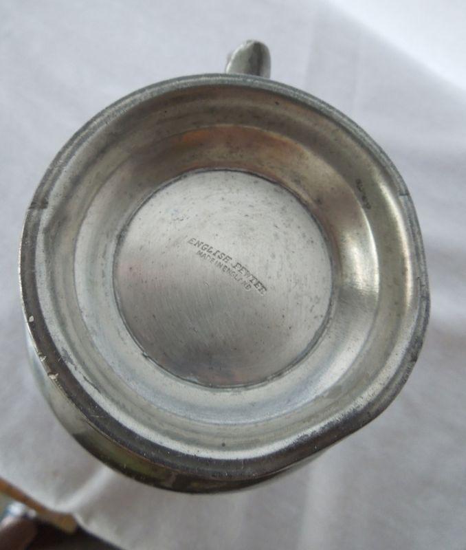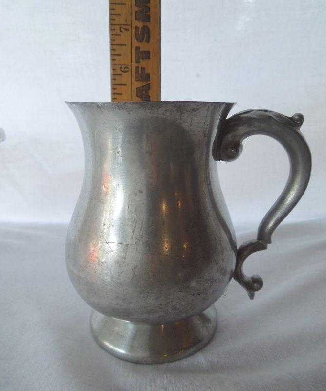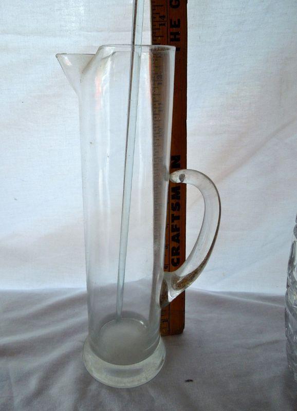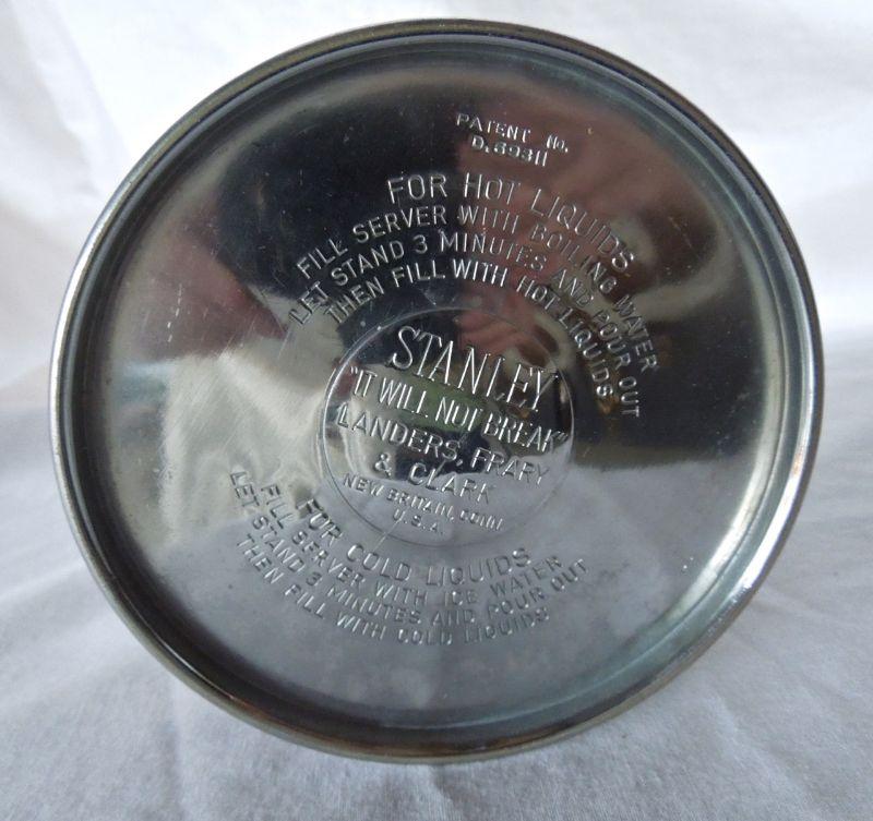 Nice white glass (not milk) ruffled edge embossed cake stand with no markings; an eenglish pewter drinking mug with a wee dent on bottom edge; a stainless Stanley hot beverage carafe with Medical seal on front; a cut glass vase and an very tall clear glass pitcher with glass swizzle stick.