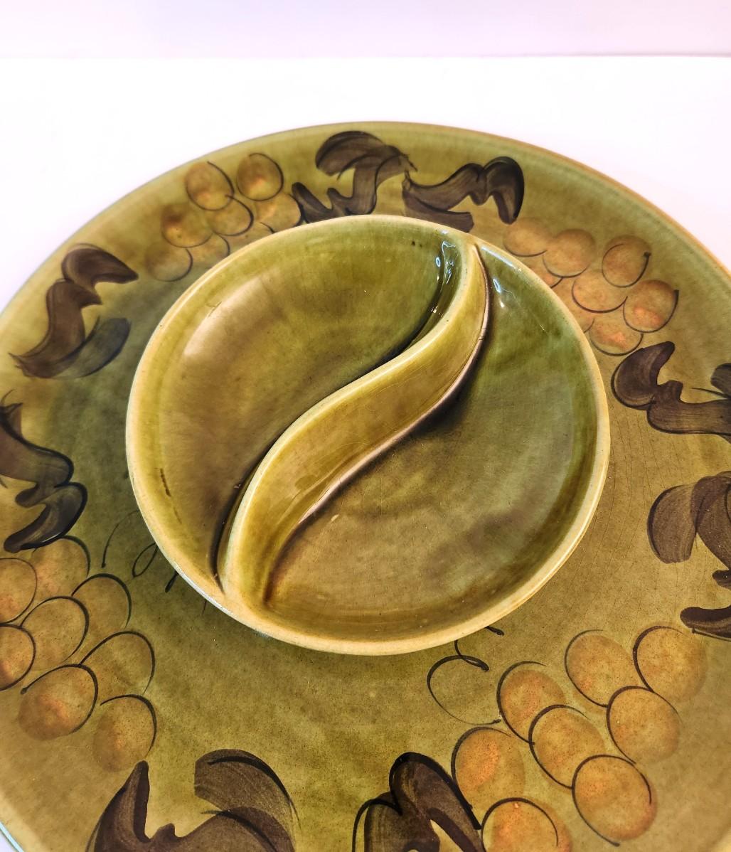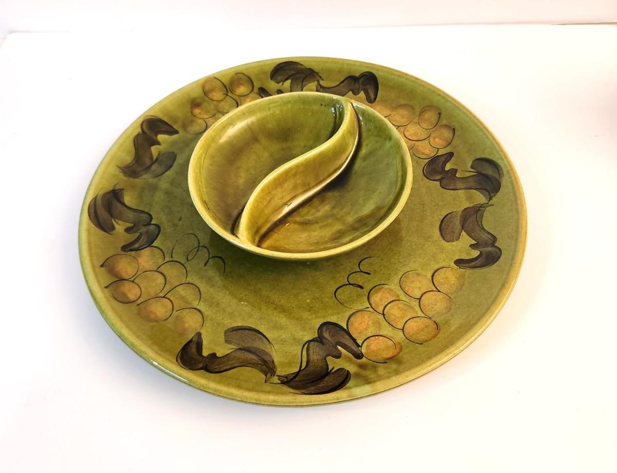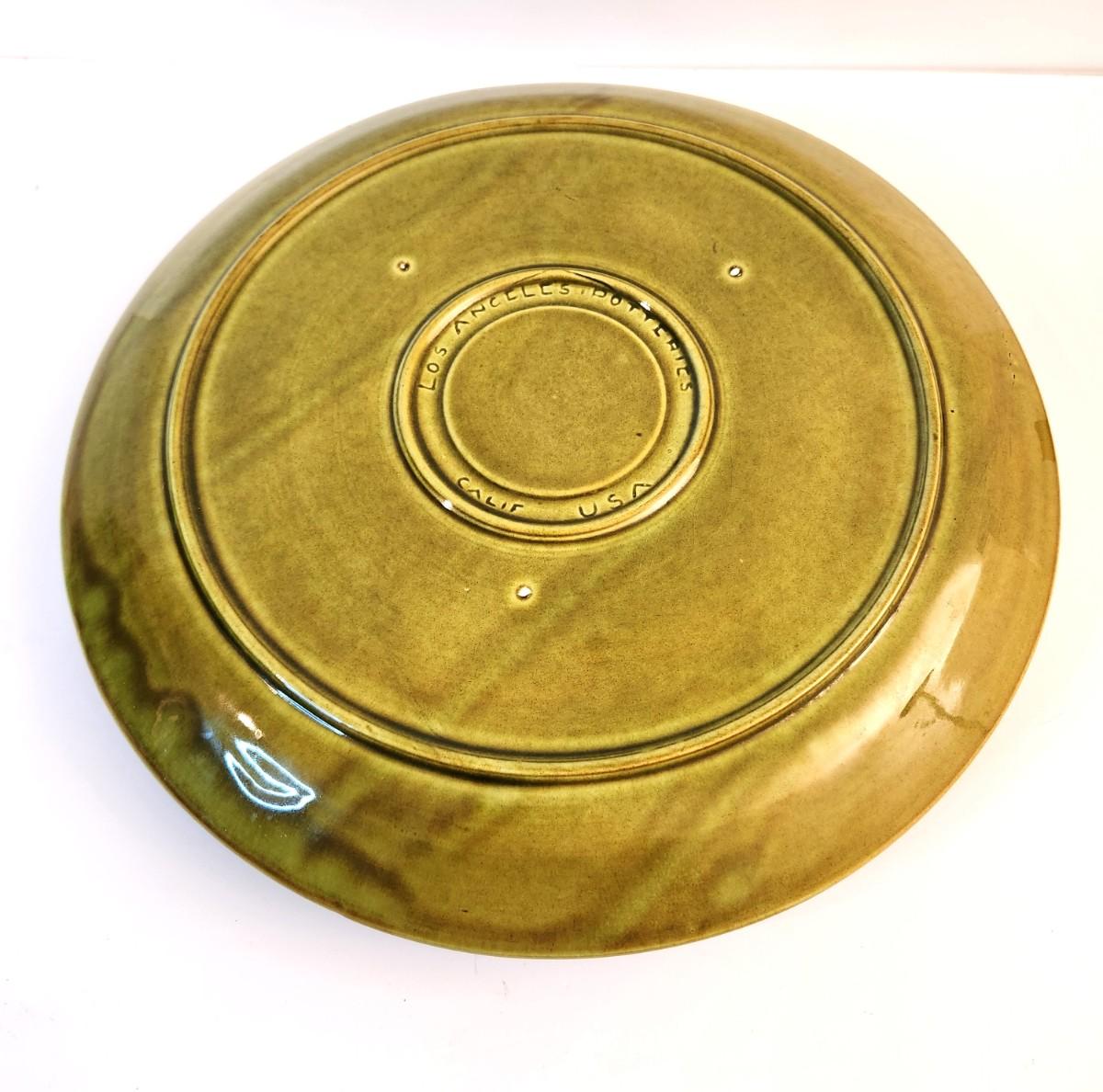 Vintage Avocado green chip/dip by Los Angeles Pottery Company (marked) - 14" across, good condition - midcentury modern.