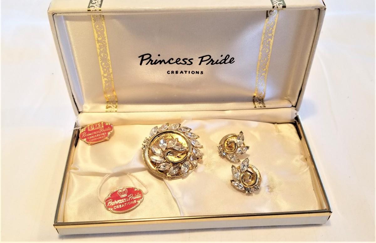 Nice vintage demi-parure here in vintage box - Princess Pride set in excellent condition - stones nice and clear. Earrings are clip. Box has some wear. Brooch is 1.75" across, earrings are .75" tall.
