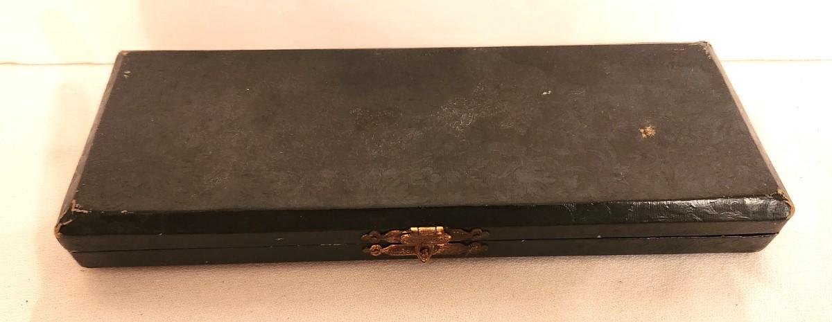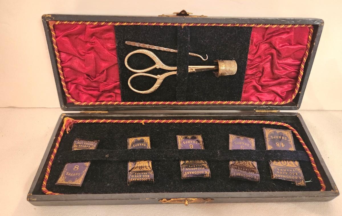 Ca 1910 Dewing/Notions box with Needles, thimble, sewing scissors, small button hook. All original.