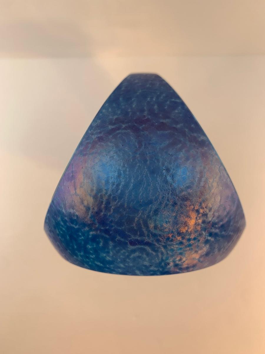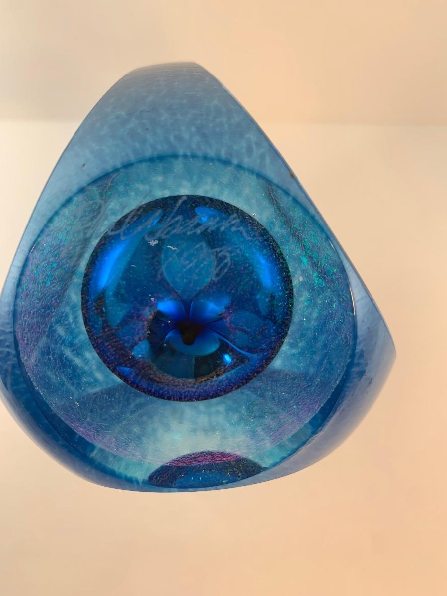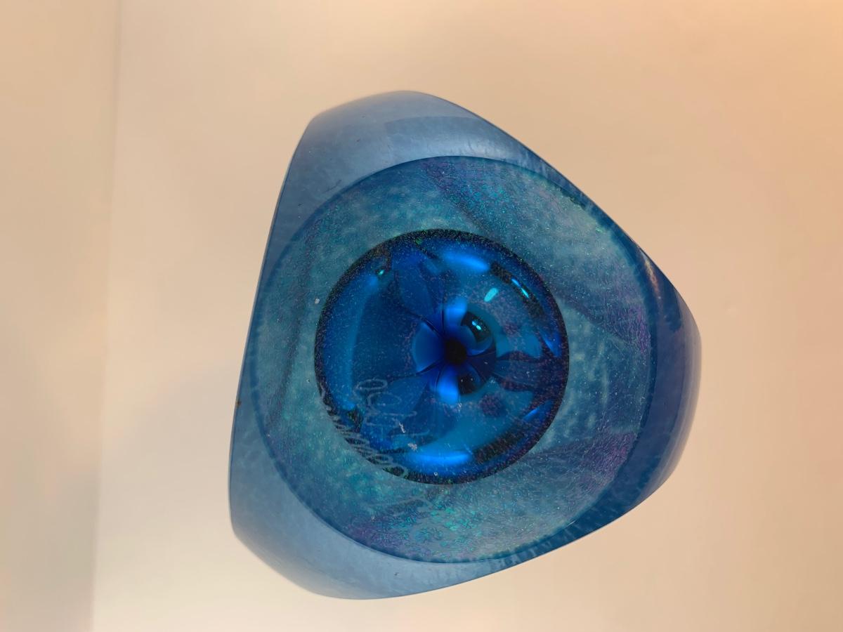 1988 Tom Philabaum multi-faceted leather look outer glass with blue orb in center. Signed on bottom "Philabaum 1988", 3" x 3 1/4"