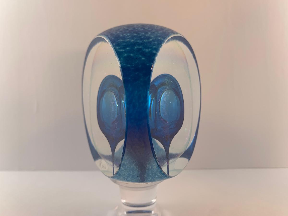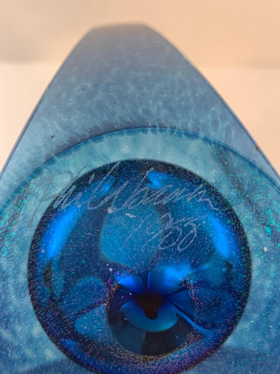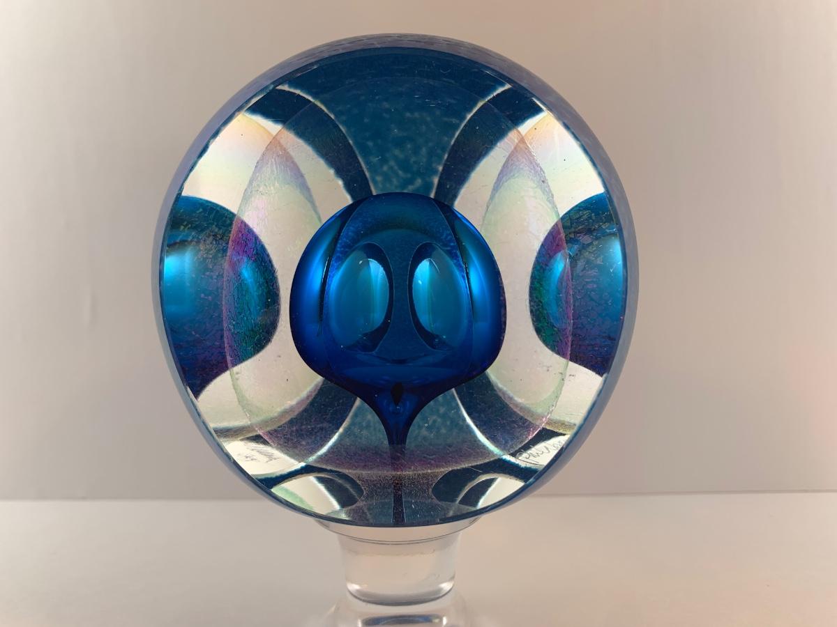 1988 Tom Philabaum multi-faceted leather look outer glass with blue orb in center. Signed on bottom "Philabaum 1988", 3" x 3 1/4"