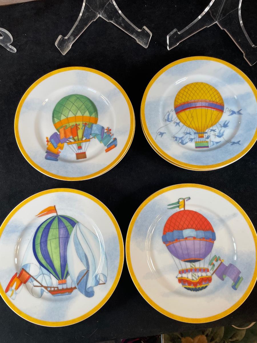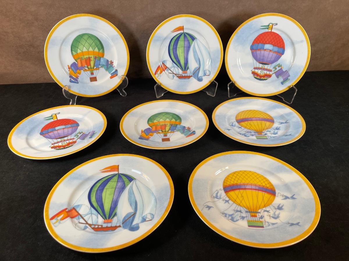 Set of 8 Montgolfiere Williams-Sonoma Fine Porcelain salad plates depicting colorful hot air balloons. two of each design. 7.75"