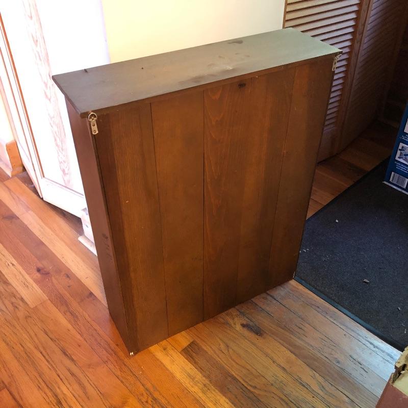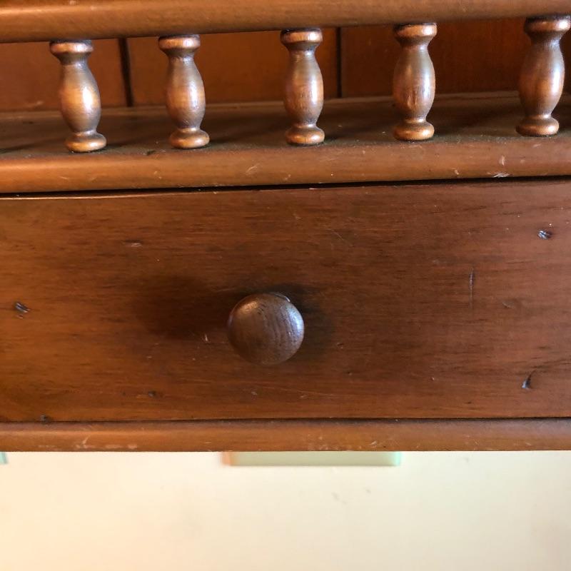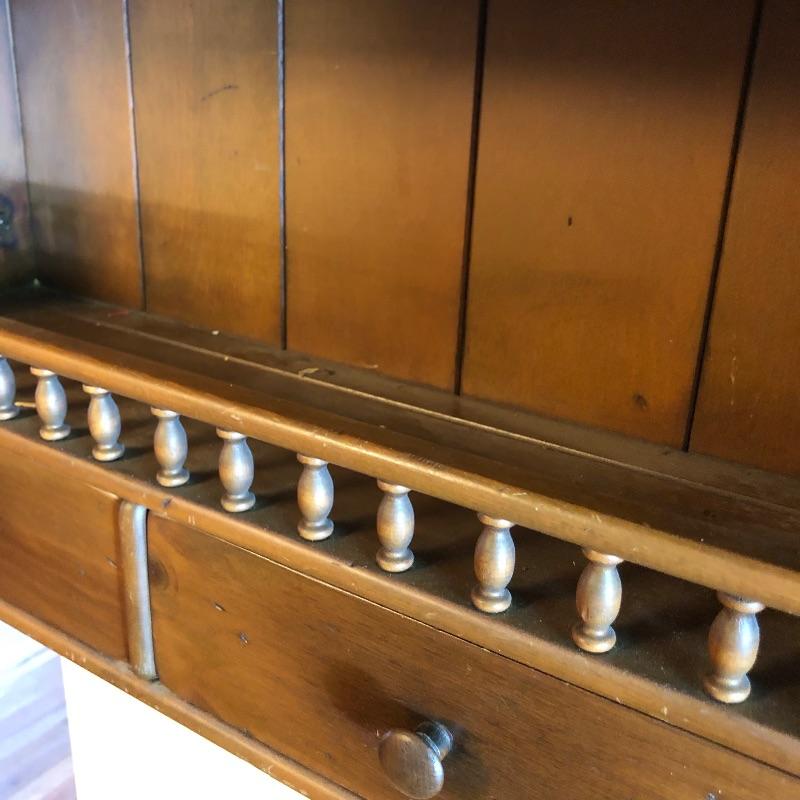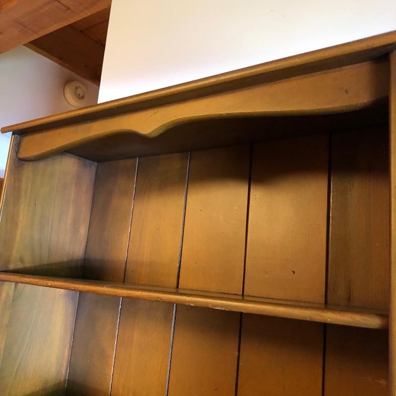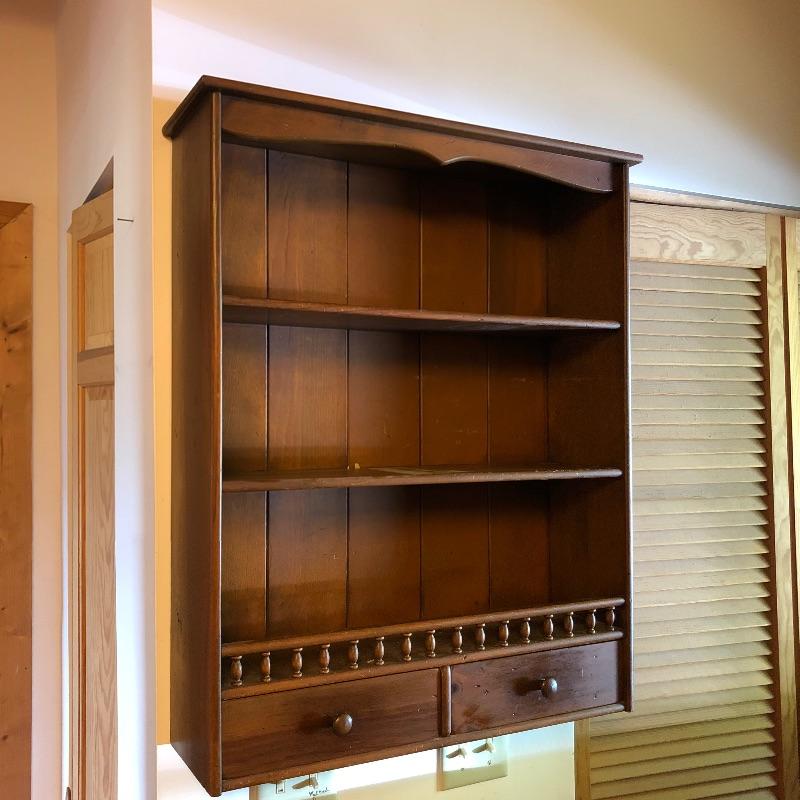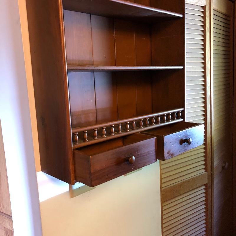 This good looking shelf unit would look great in your hallway or kitchen and provide some handy storage as well! It has 3 shelves and 2 small drawers. It appears to be made from a medium tone pressed wood.