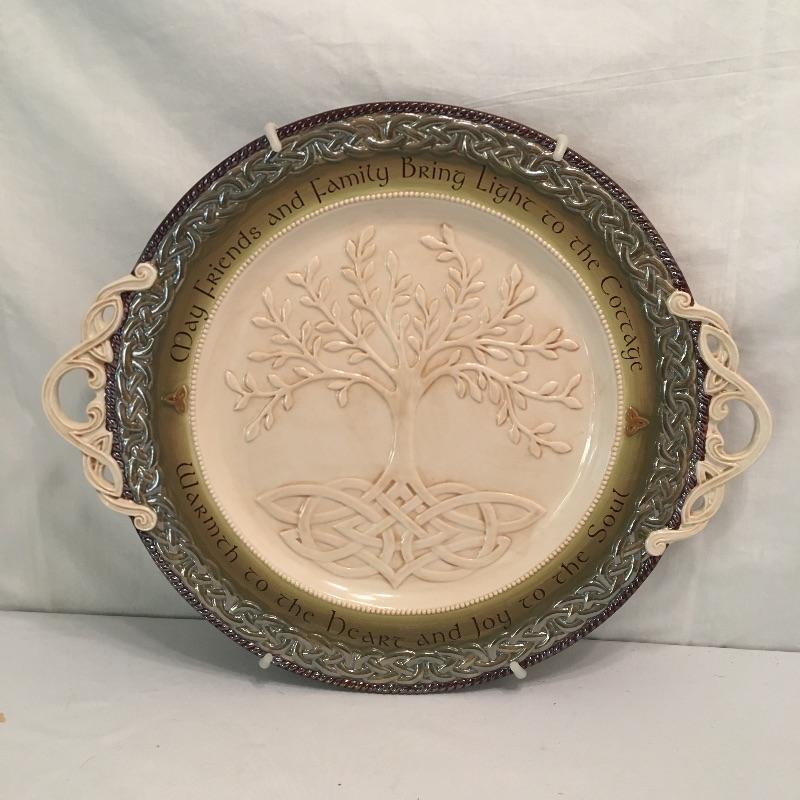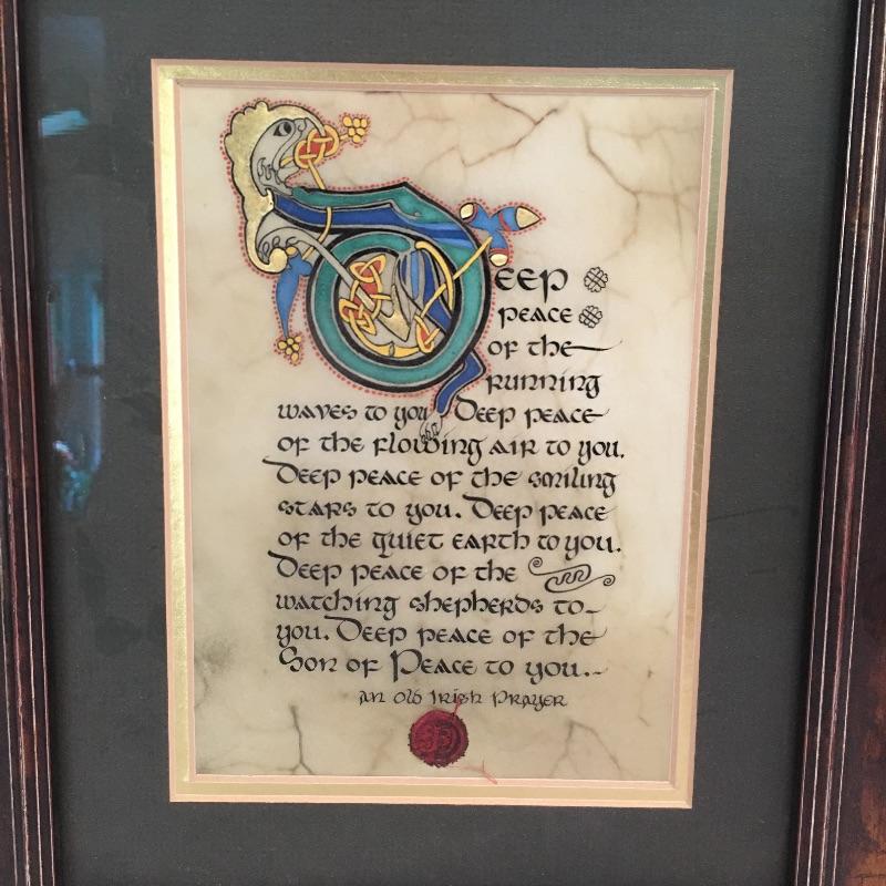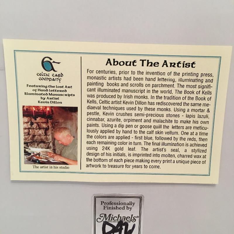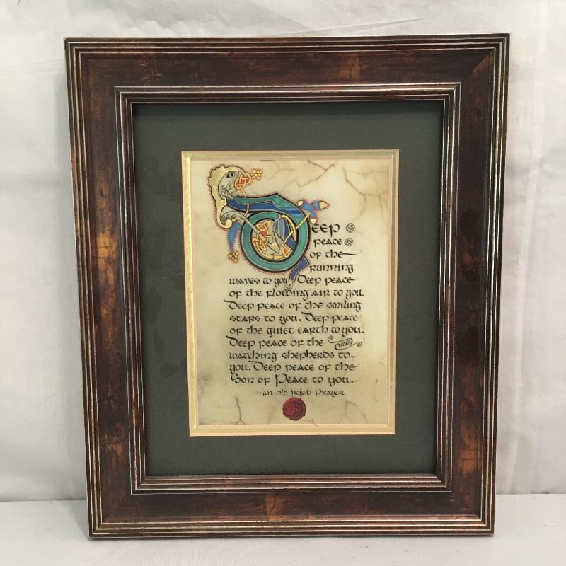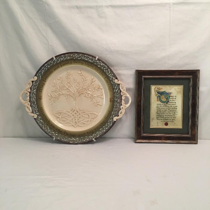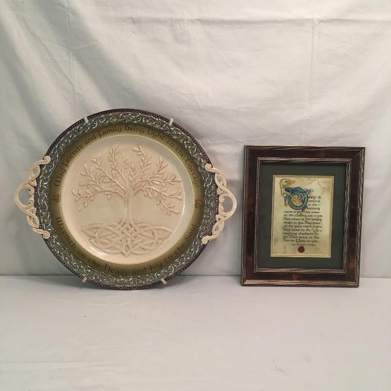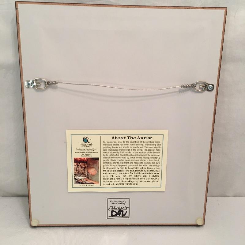 This Celtic collection includes a large plate with handles and a hand lettered Irish prayer by Kevin Dillon and is done using traditional methods and is framed and matted. Plate measures 15.5” x 19”.
