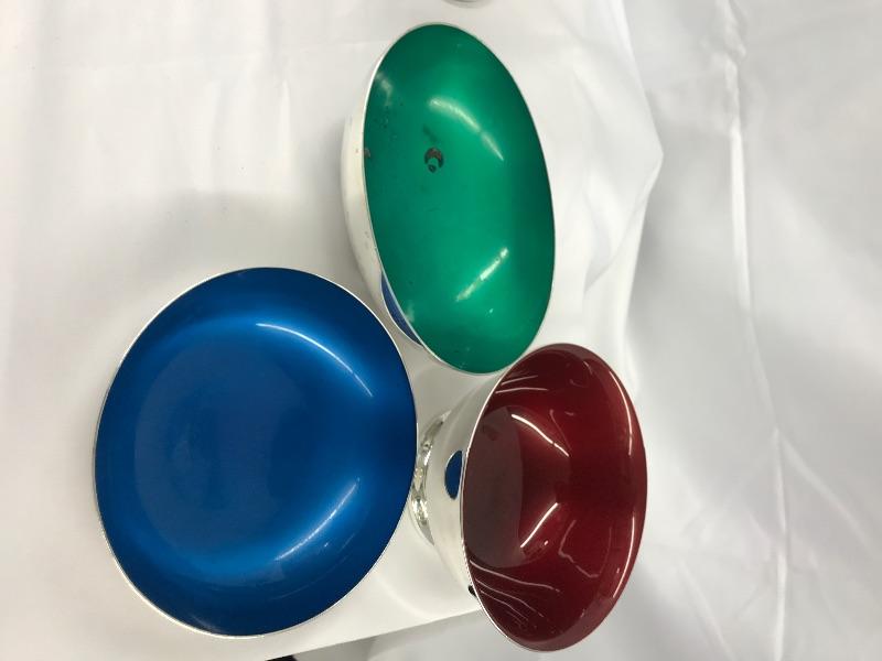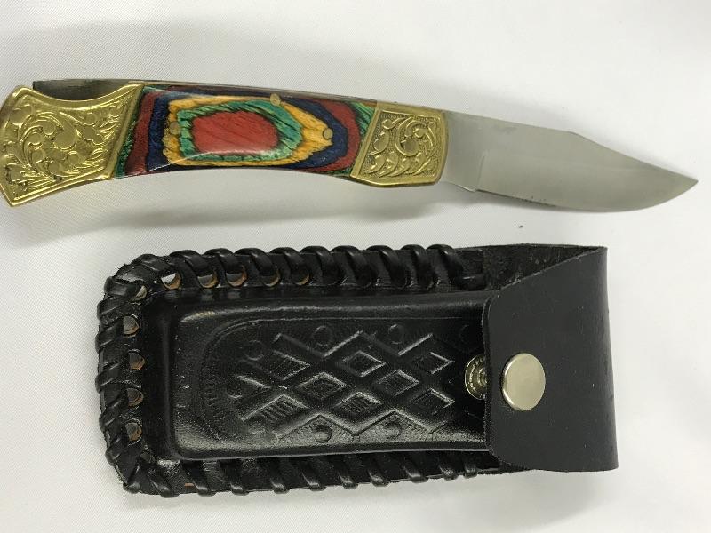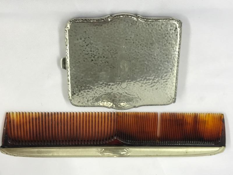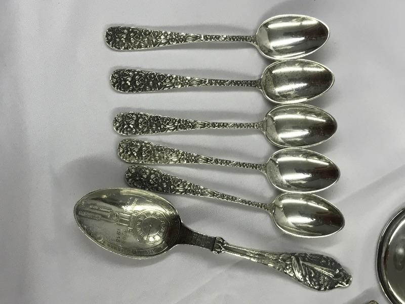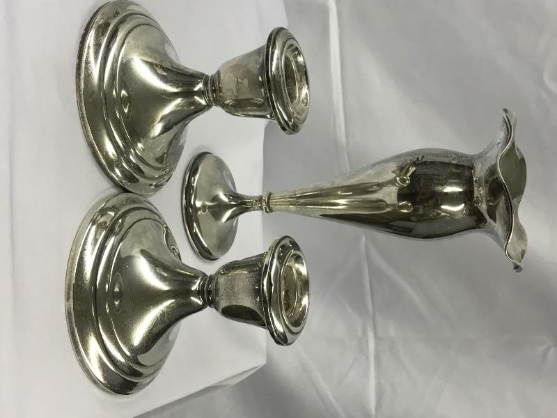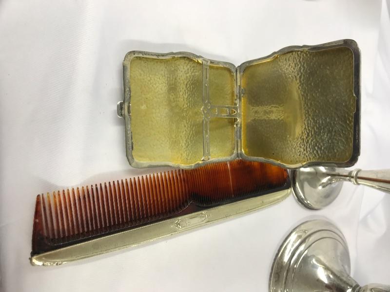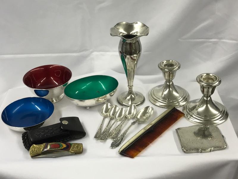 This lot includes a pair of sterling silver candlesticks by Gorham (cement filled) 3-1/2” tall, Sterling Silver vase 7” tall, 5 small sterling silver spoons by Stieff, Sterling Silver collector spoon Elizabeth Greener Birth Record, Sterling Silver cigarette case , Comb with sterling silver handle, 3 small Reed & Barton enamel bowls and a pocket knife with brass and wood handle blade is 3” long and comes with leather case