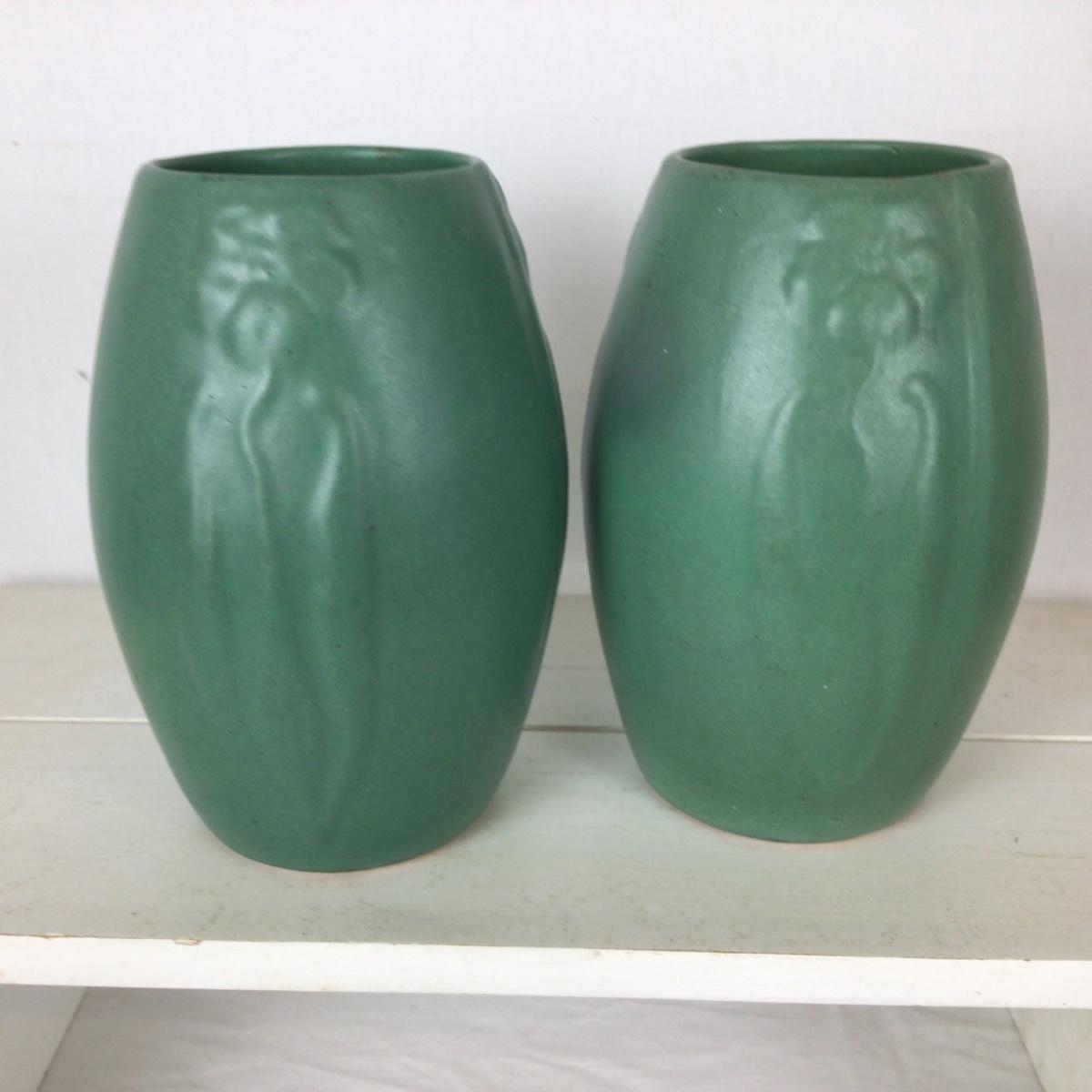 Pair of Zanesville Stoneware in Matte Green stylized flowered Vases