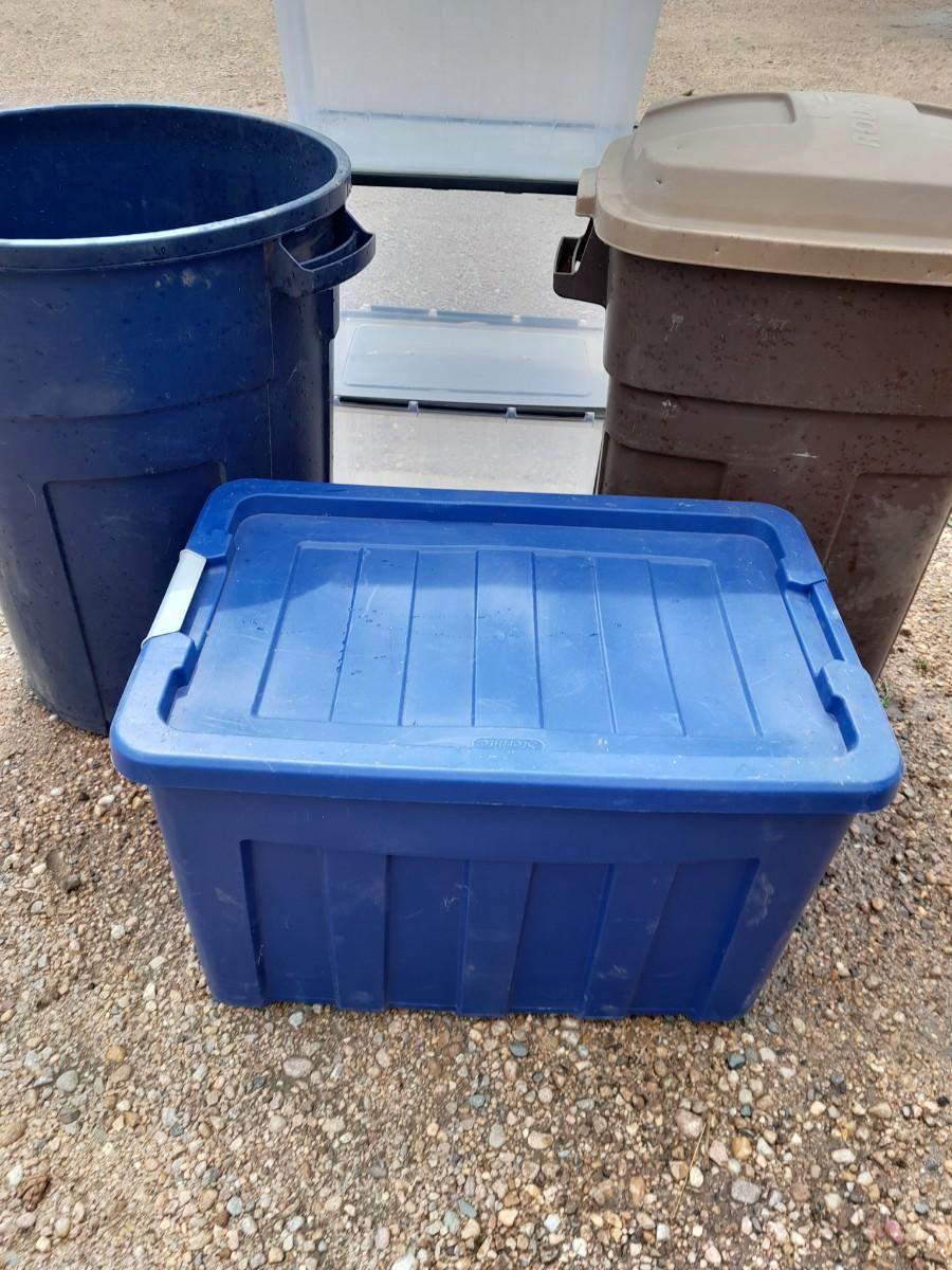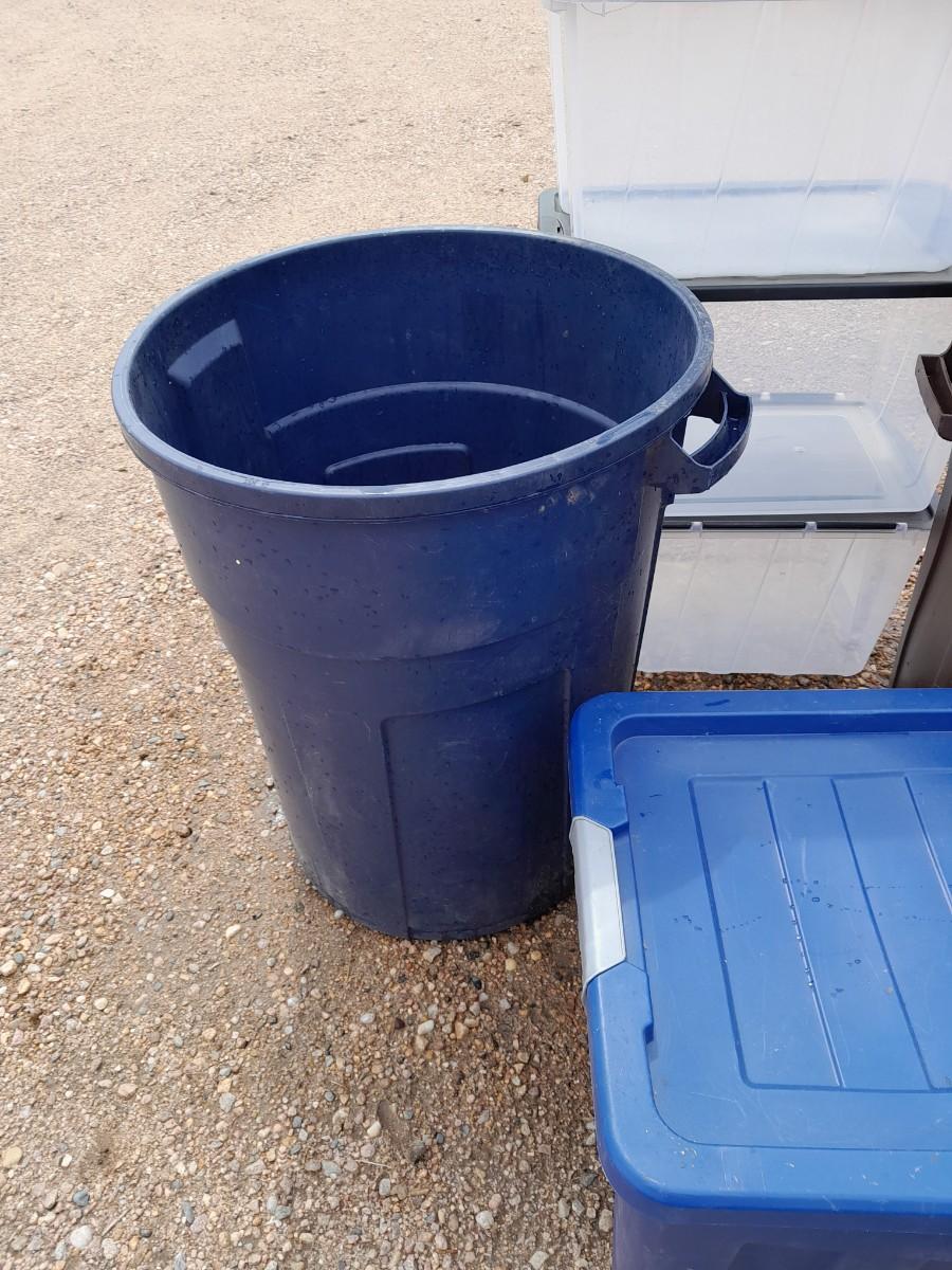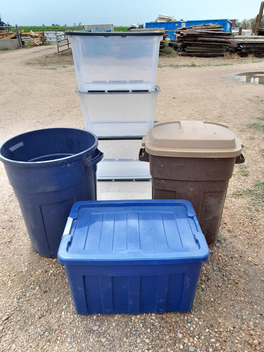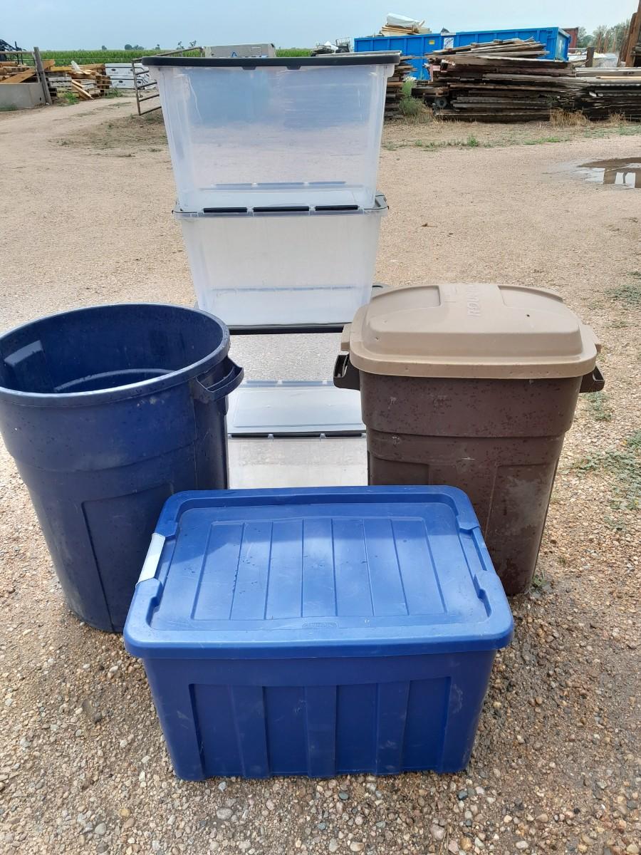 SEVERAL TOTES WITH LIDS, AND TWO TRASH CANS