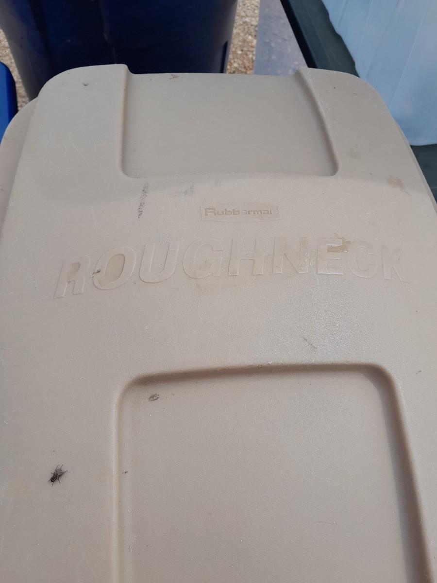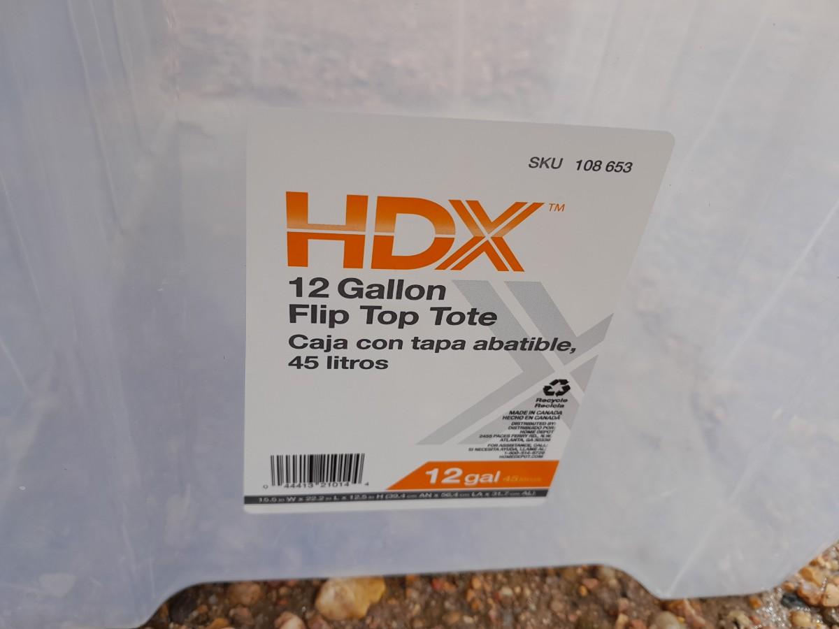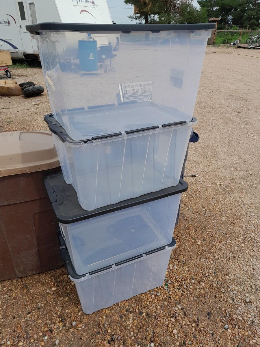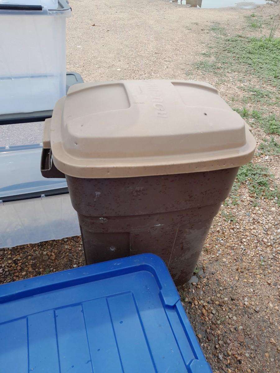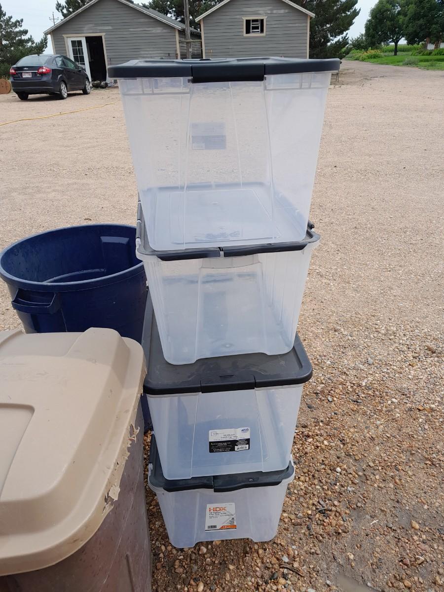 SEVERAL TOTES WITH LIDS, AND TWO TRASH CANS