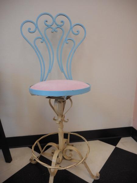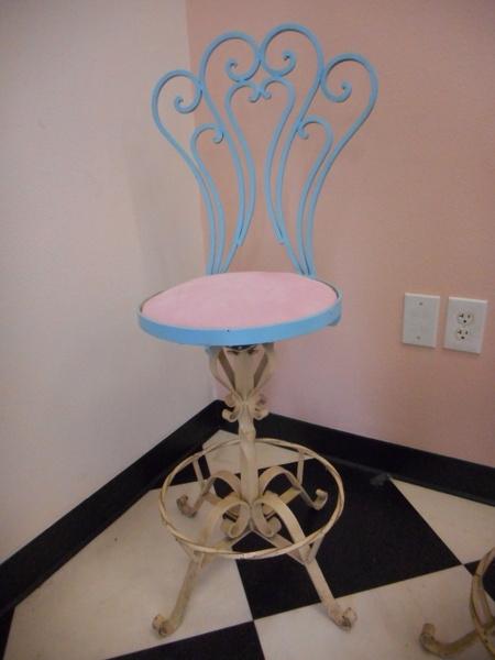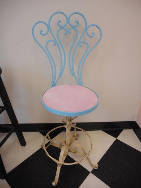 Turquoise Painted Wrought Iron Ice Cream Palor Chair with pink fabric covered seat
