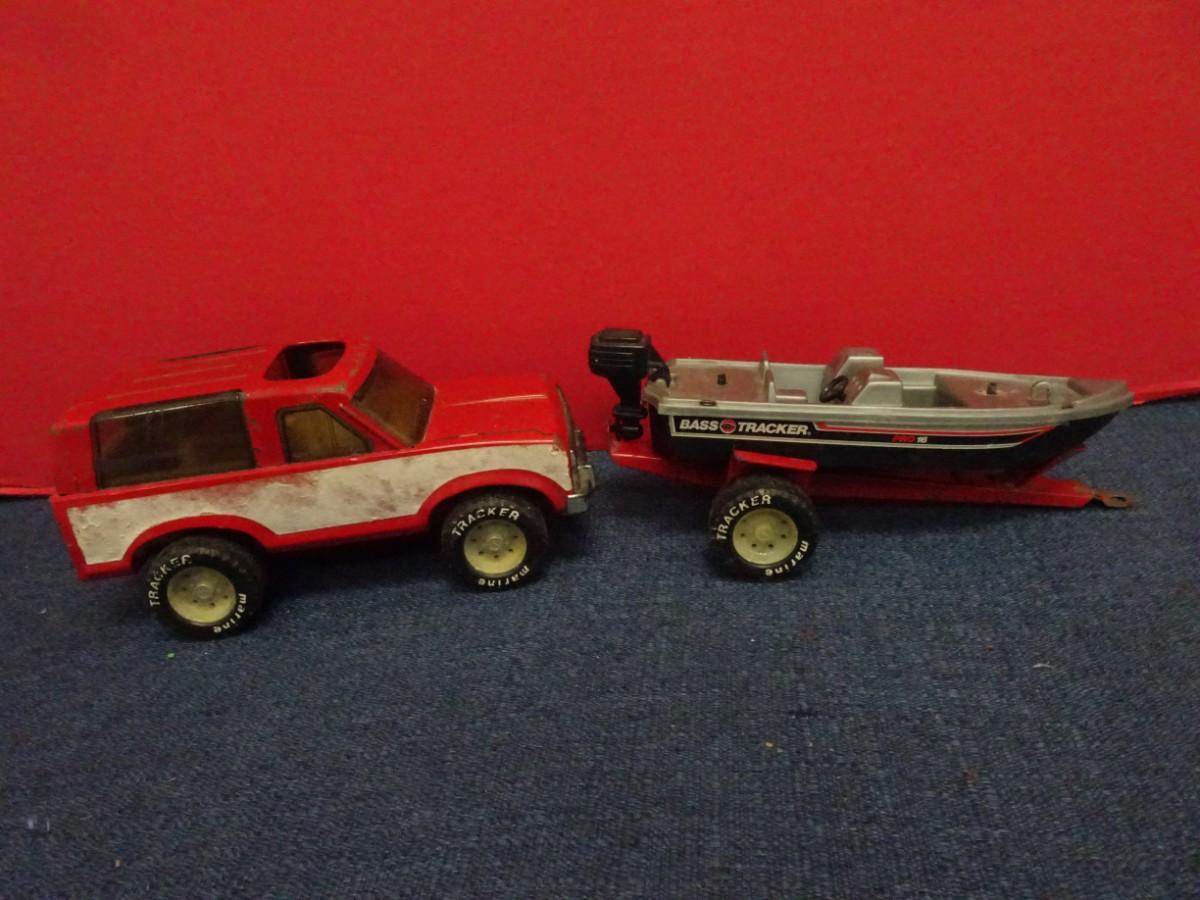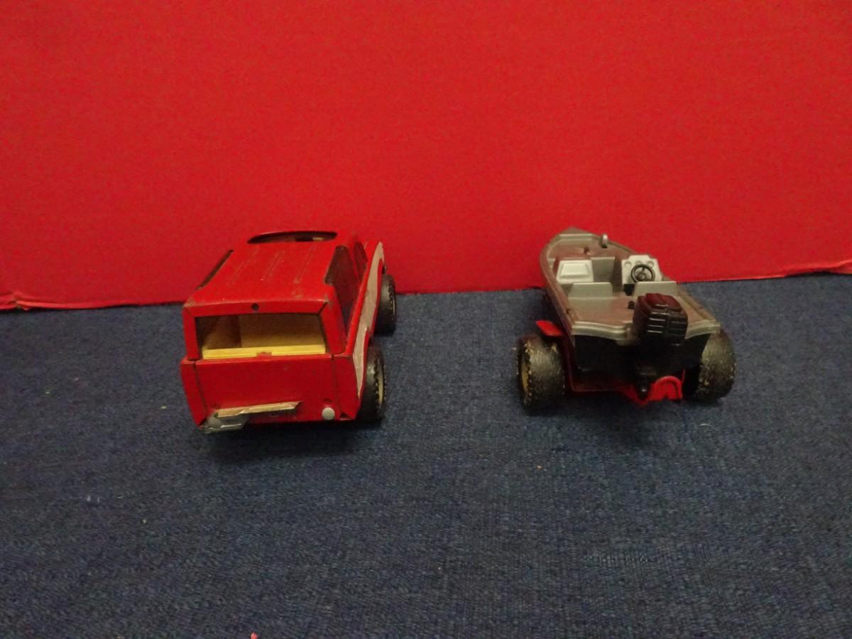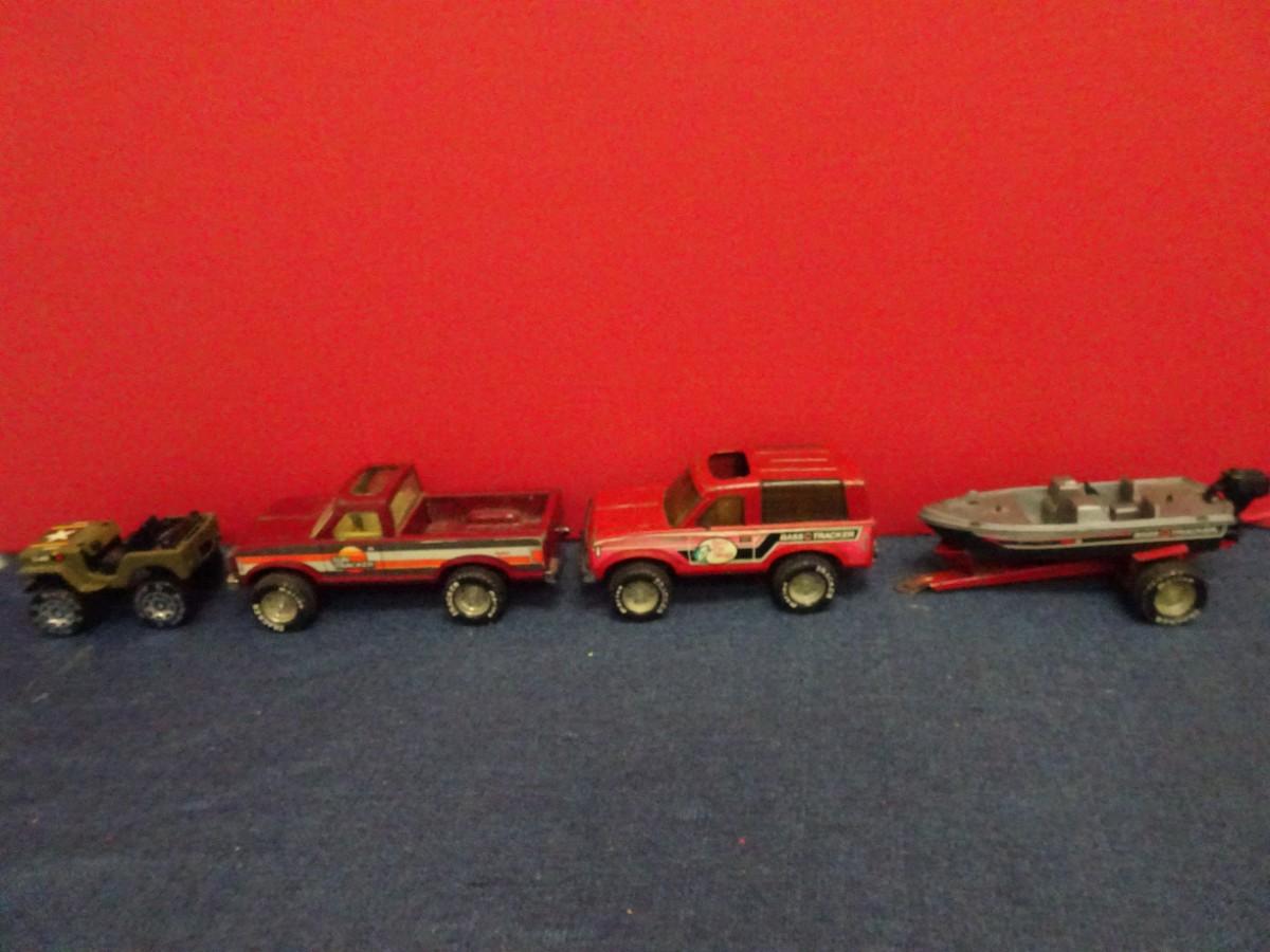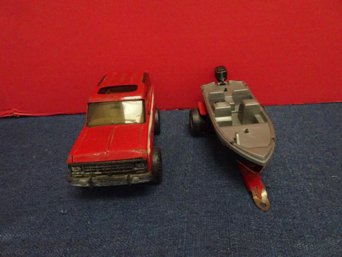 LOT 625. TOY TRUCKS AND BOAT. SEE PICS FOR CONDITION ISSUES
