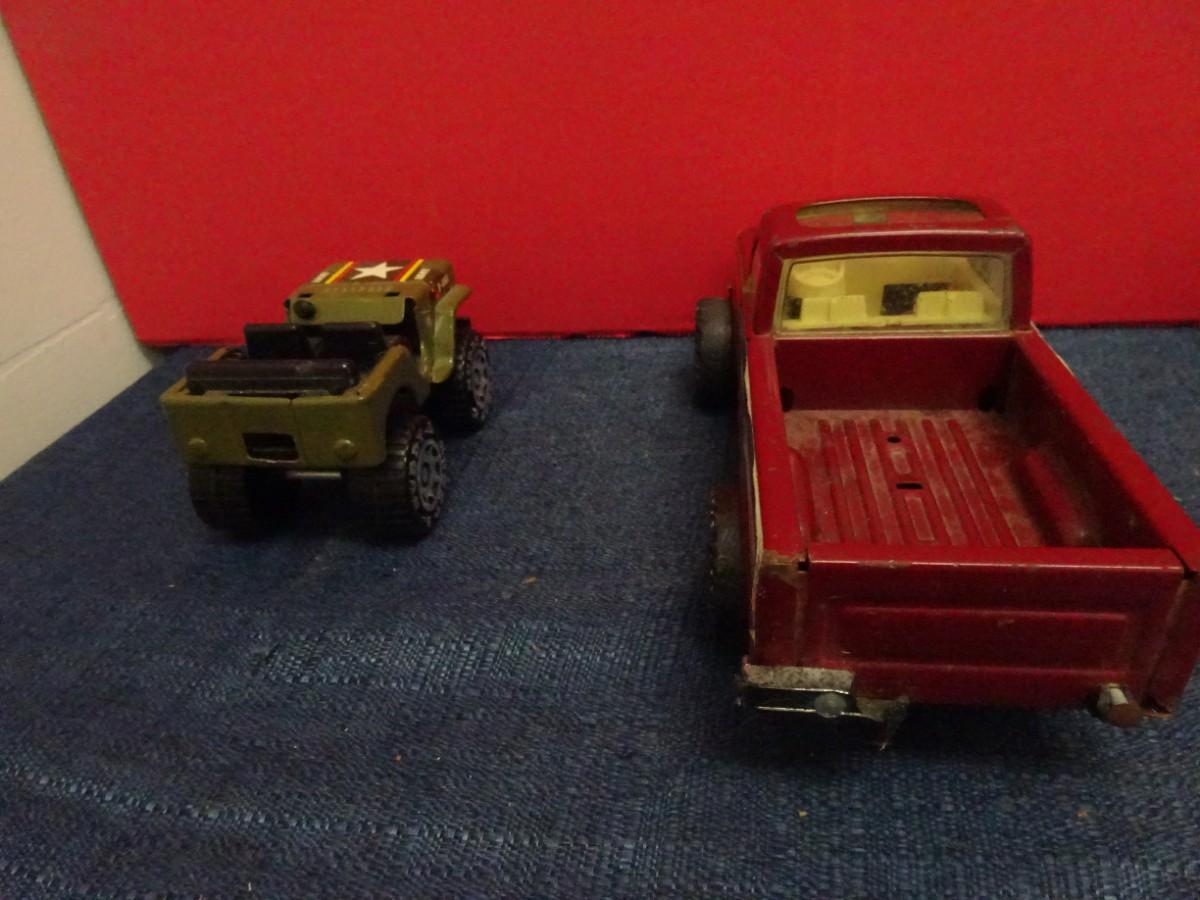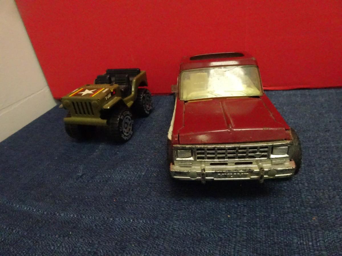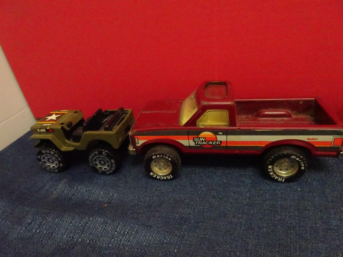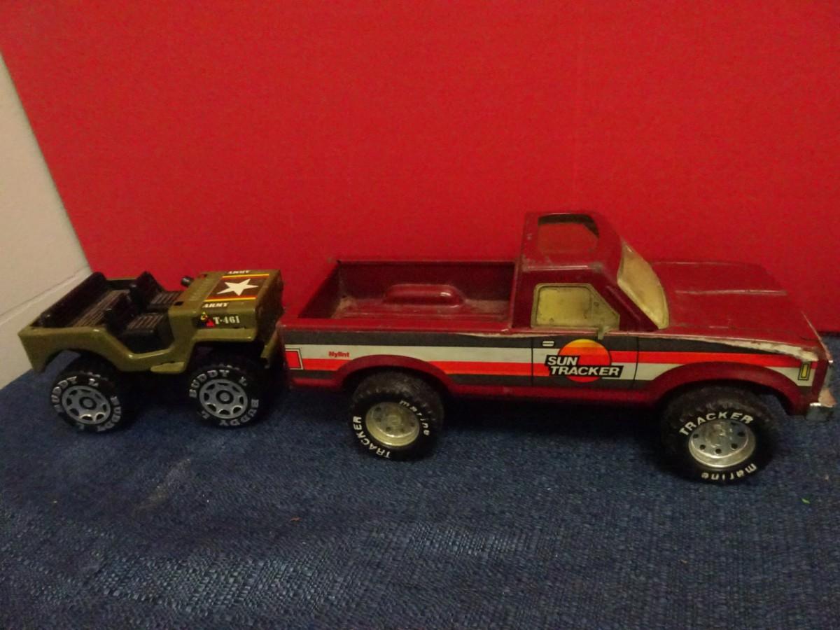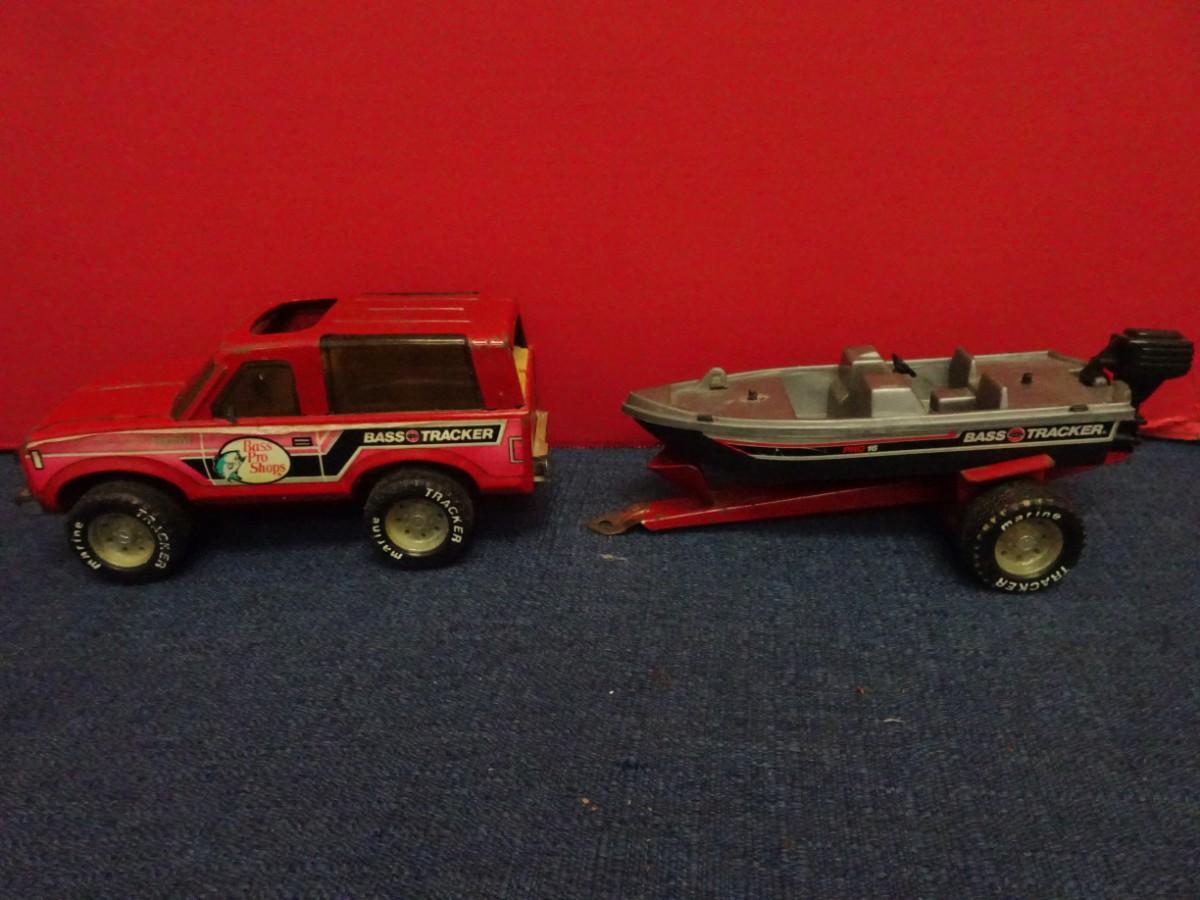 LOT 625. TOY TRUCKS AND BOAT. SEE PICS FOR CONDITION ISSUES
