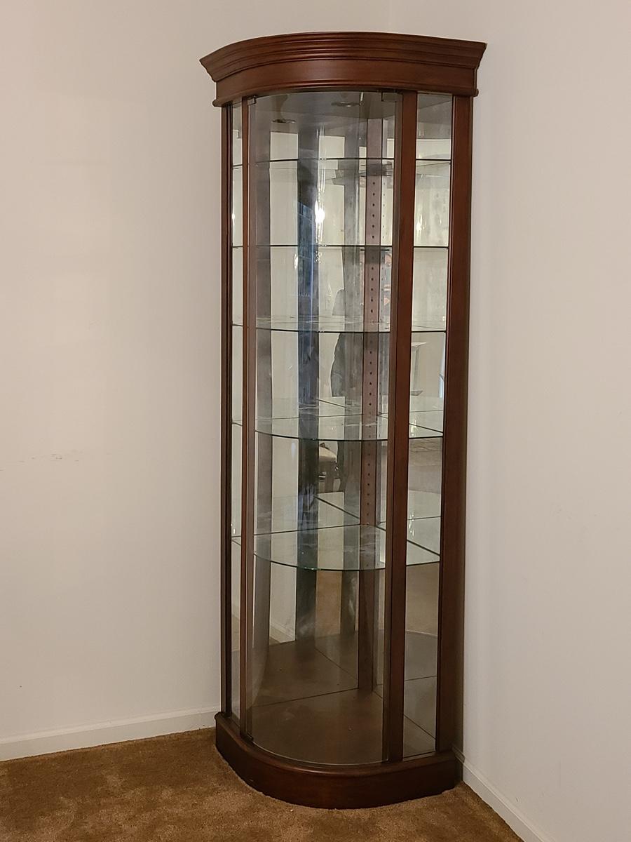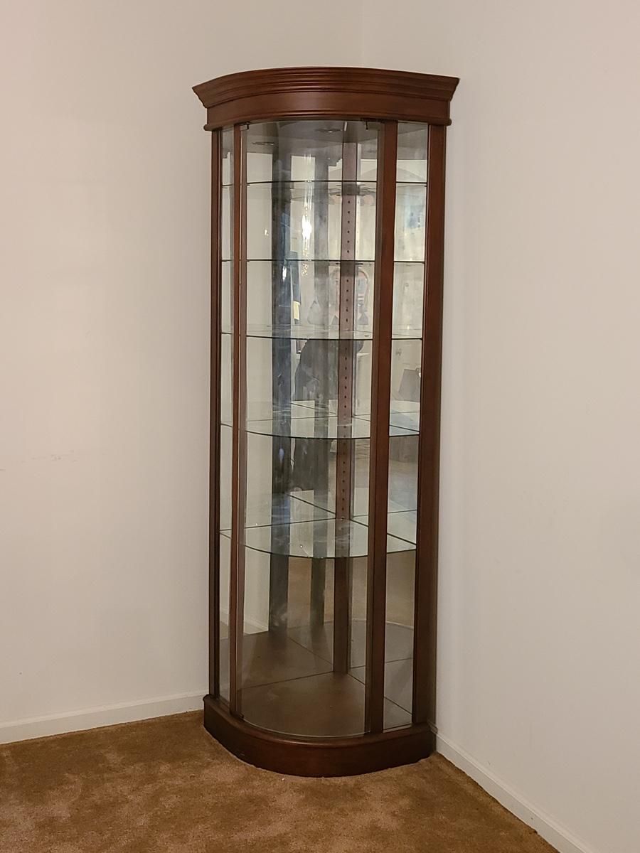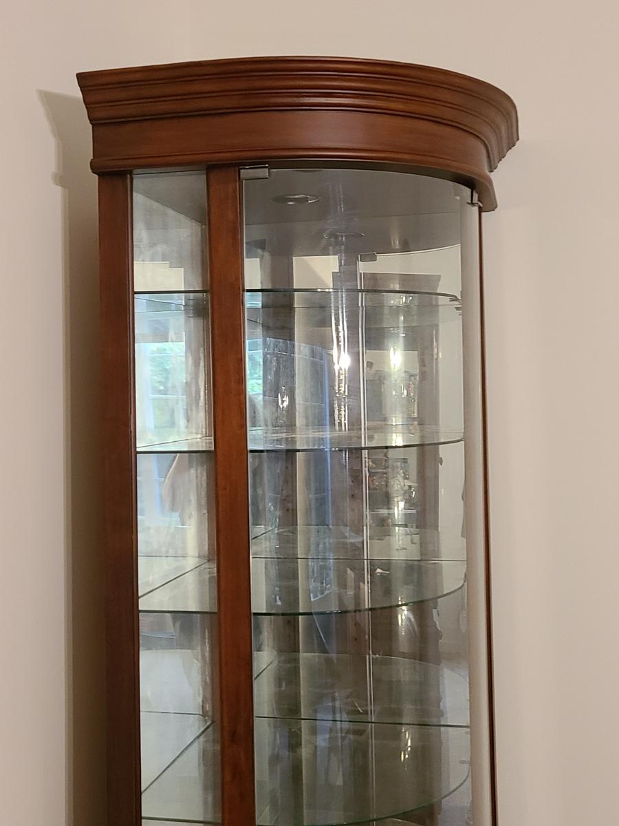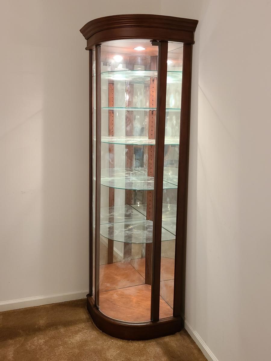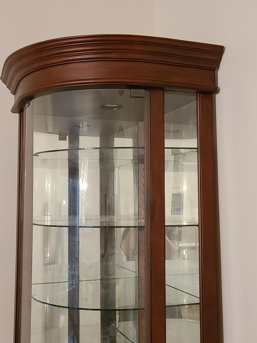 36x21x80 inches tall. This lovely piece is perfect for displaying dishes, teacups, or collectibles. It has a mirror back, bow front with glass, and lighted on top. Needs a light dusting. Please see all pictures as they are the best representation of the items. The pictures show condition, measurements if taken, and what is included in the lot. Due to the large amount that we photograph and the time frame, we are not always able to take measurements. All items unless noted, are pre-owned and have been used. If you purchased furniture, you must bring help. We do not allow one person to carry large furniture out on their own. Bring help, tools and a truck for the safety of our client’s homes, and your personal safety. Company policy. Thank you.