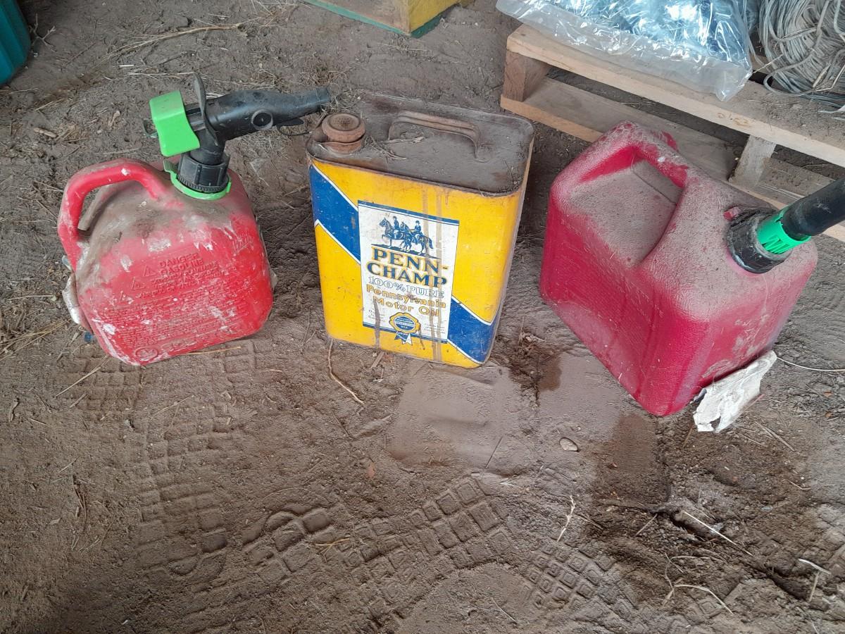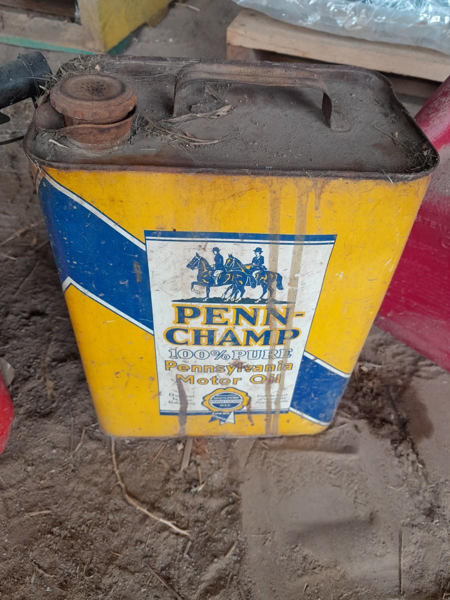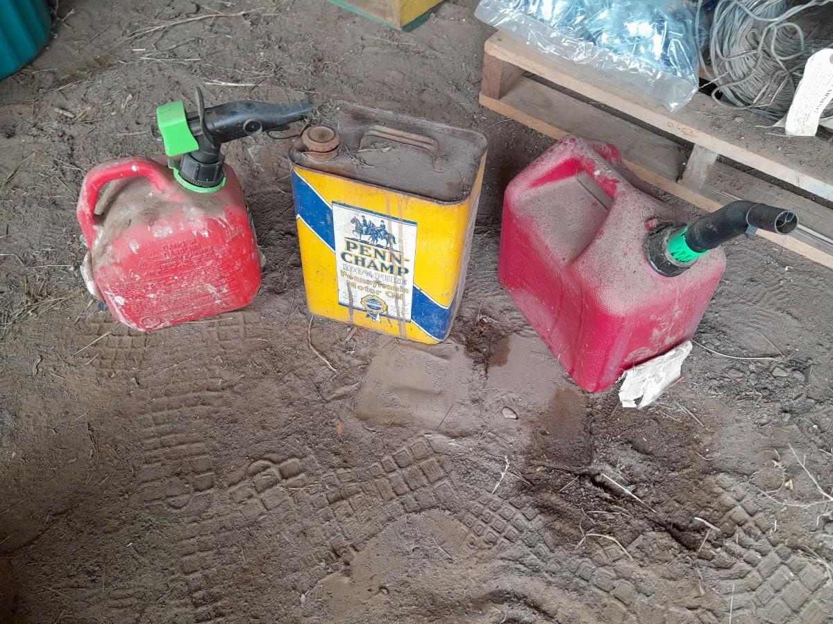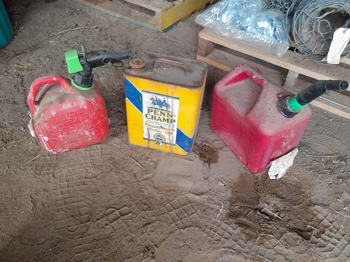TWO GAS CANS AND A METAL PENNCHAMP OIL CAN