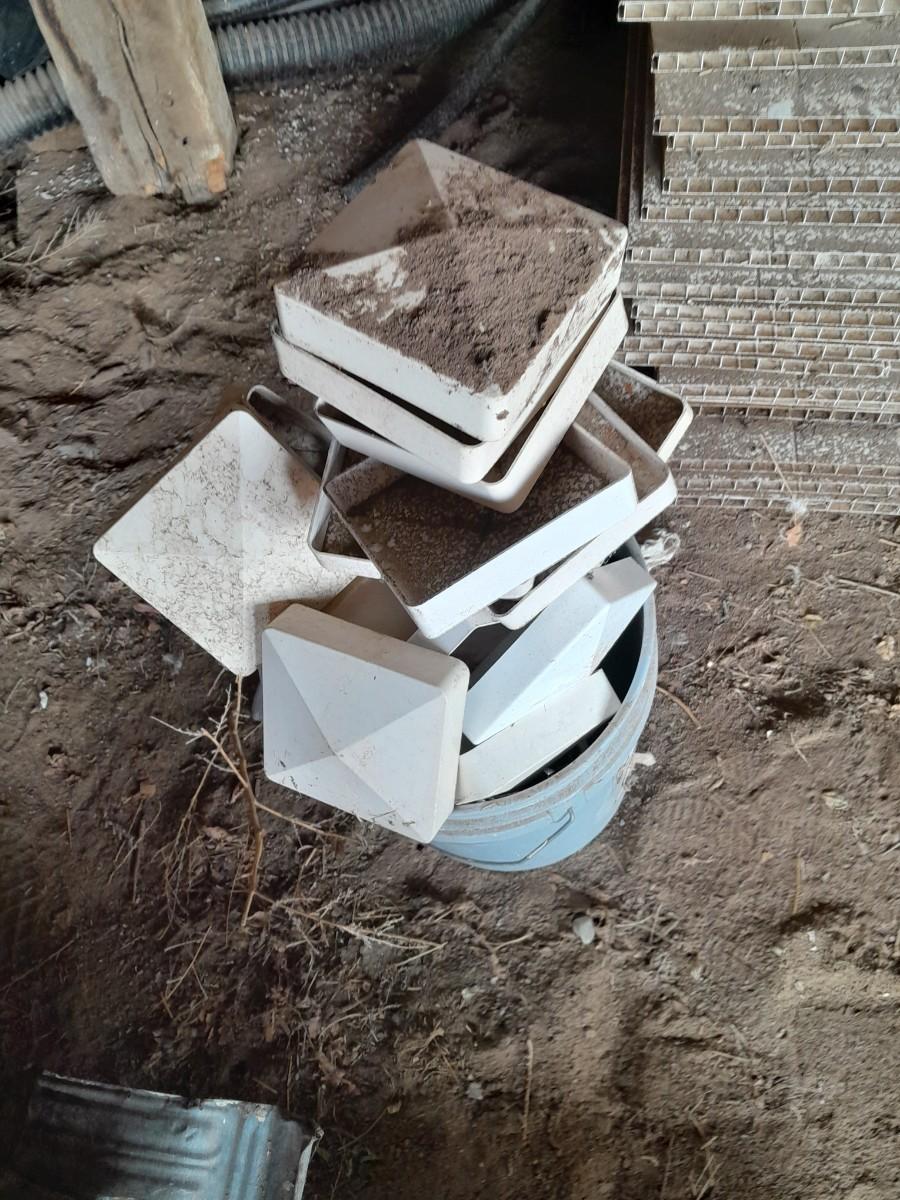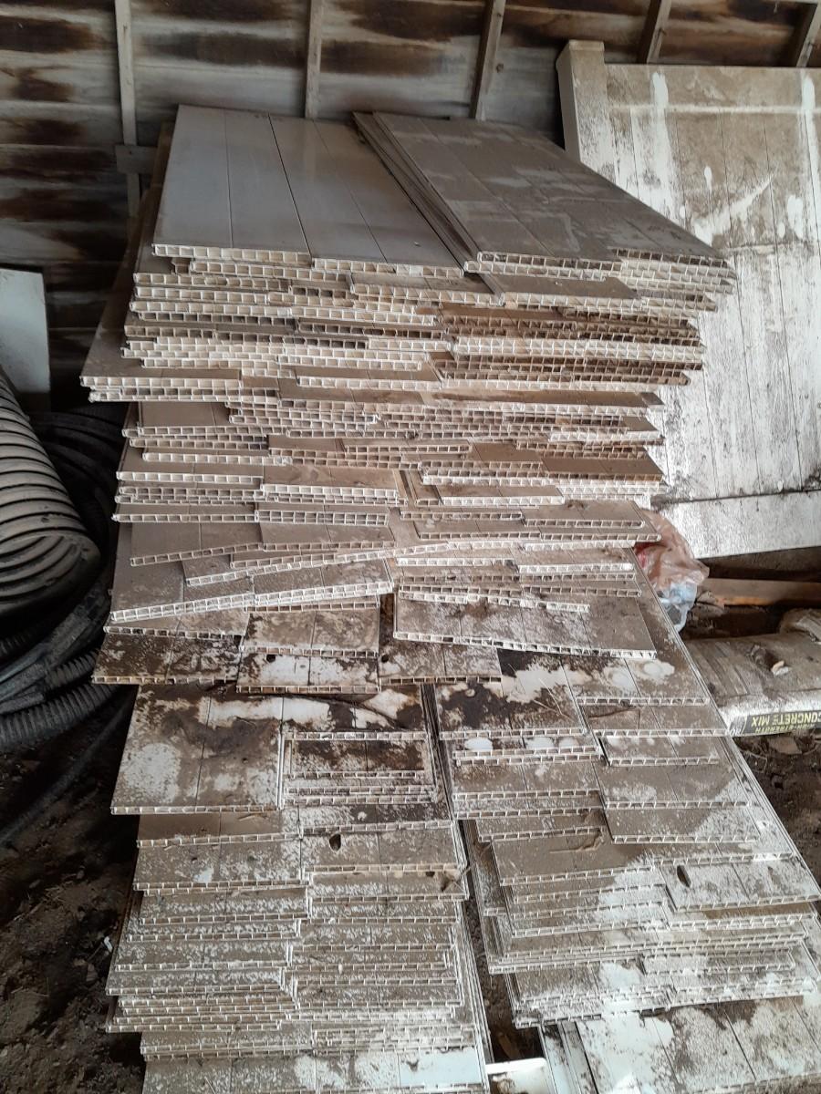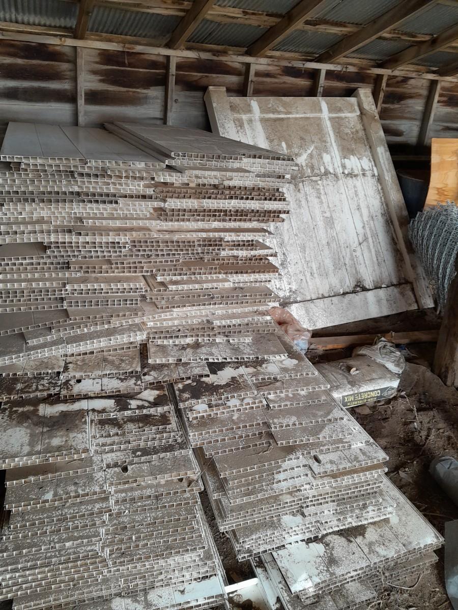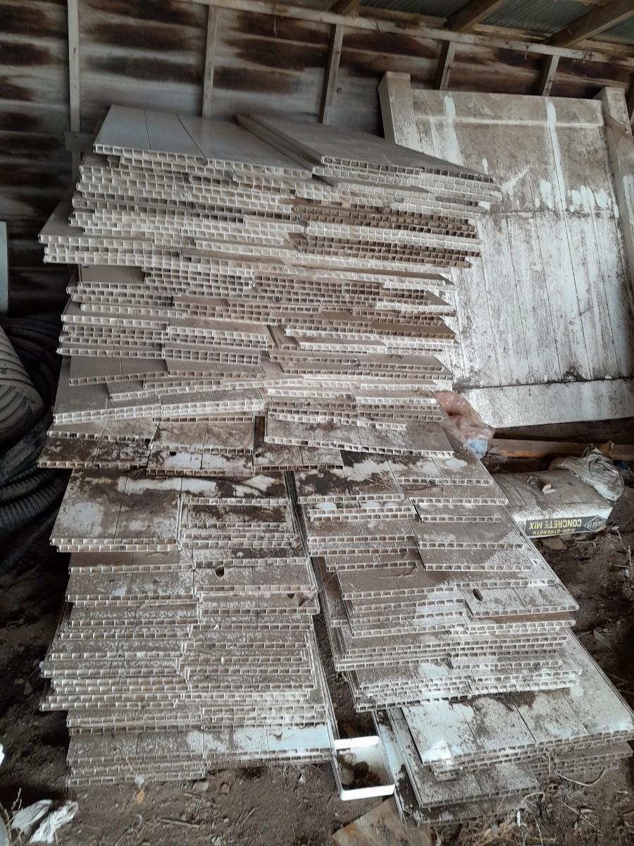 LOTS OF WHITE VINYL FENCING, POLES, AND SLATS, AND A GATE A LOT OF THIS DOES HAVE SOME HAIL DAMAGE, BUT A LOT IS STILL USABLE. DIRTY, BUT GOOD.