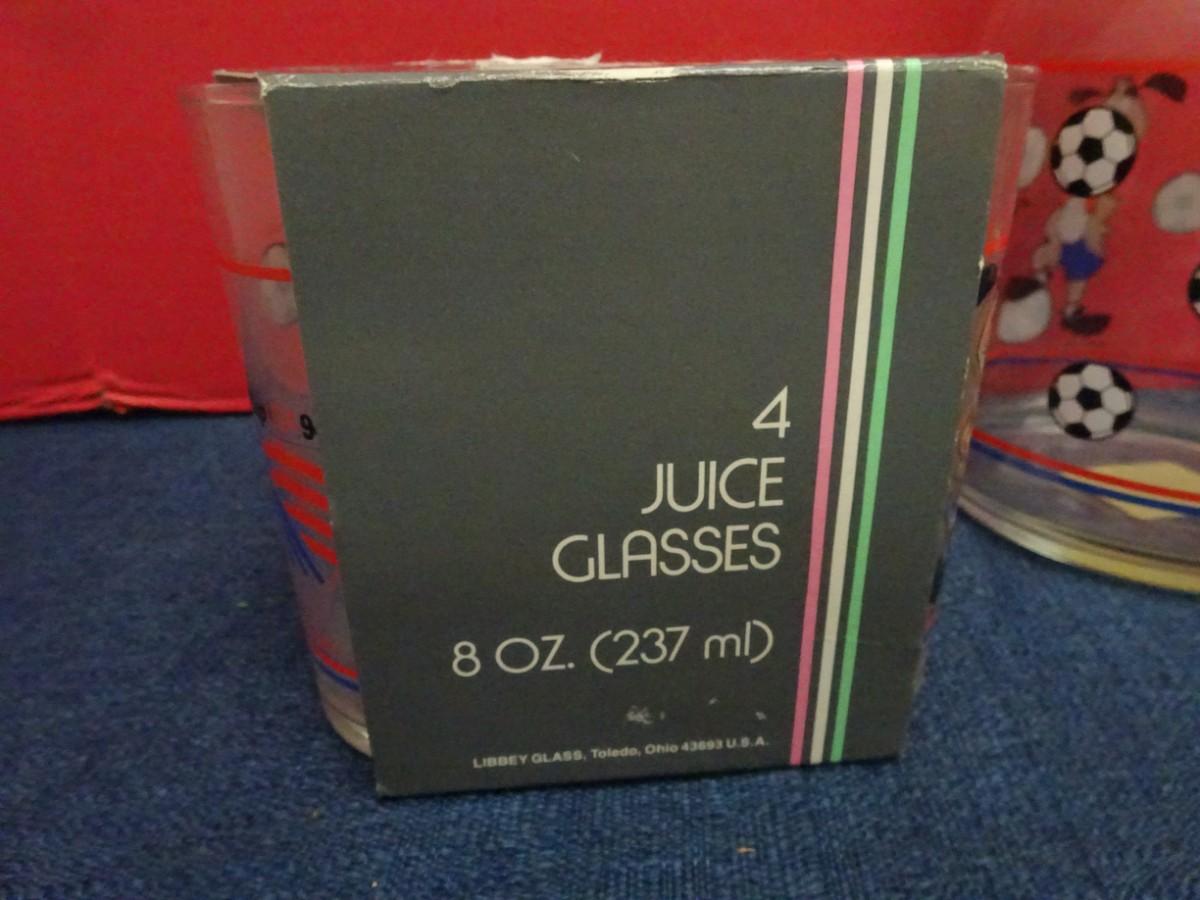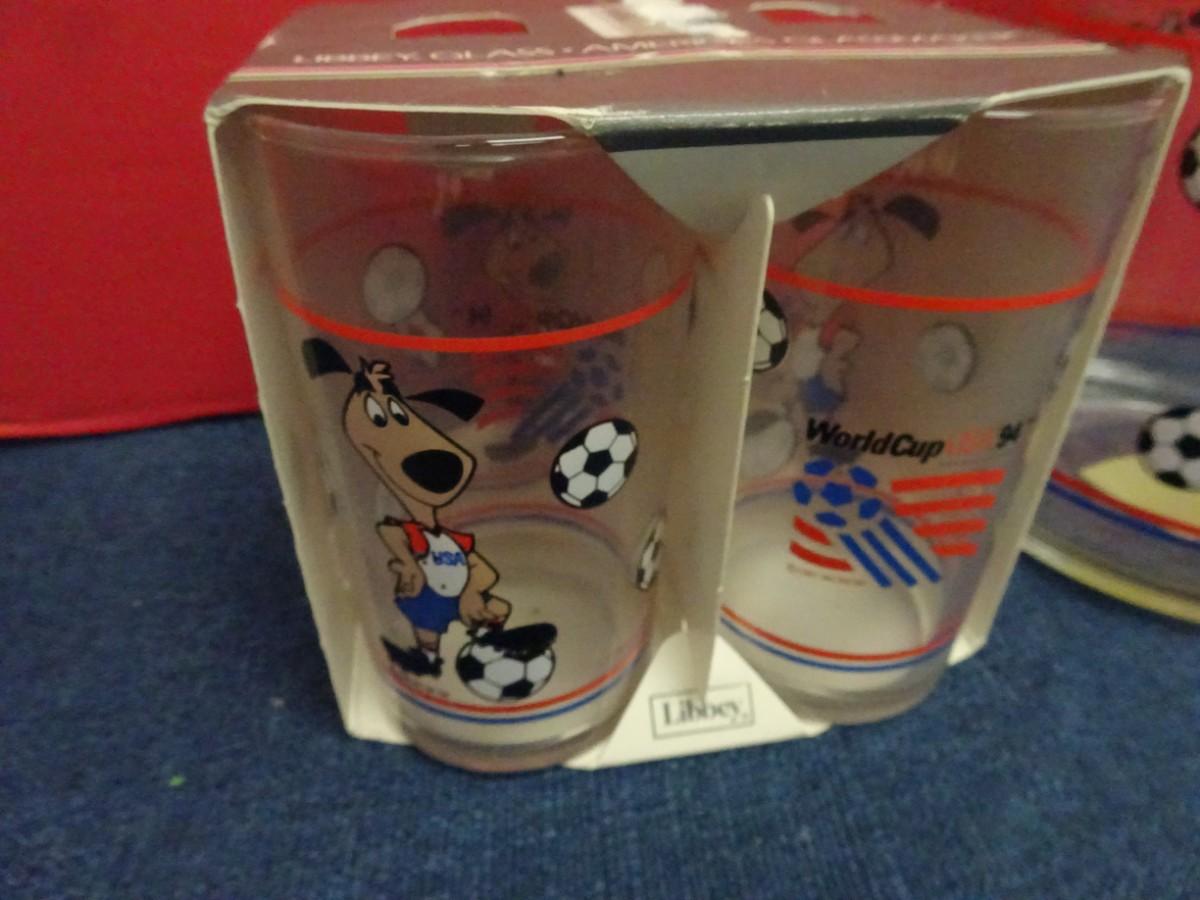 LOT 629. 1984 WORLD CUP USA LIBBEY JUICE GLASSES AND JUICE CONTAINER