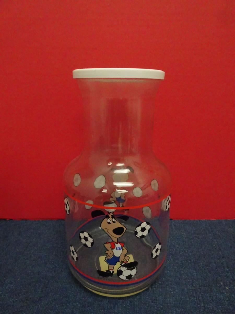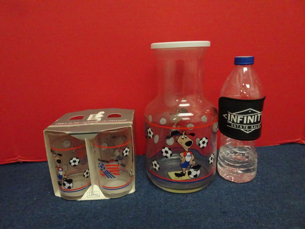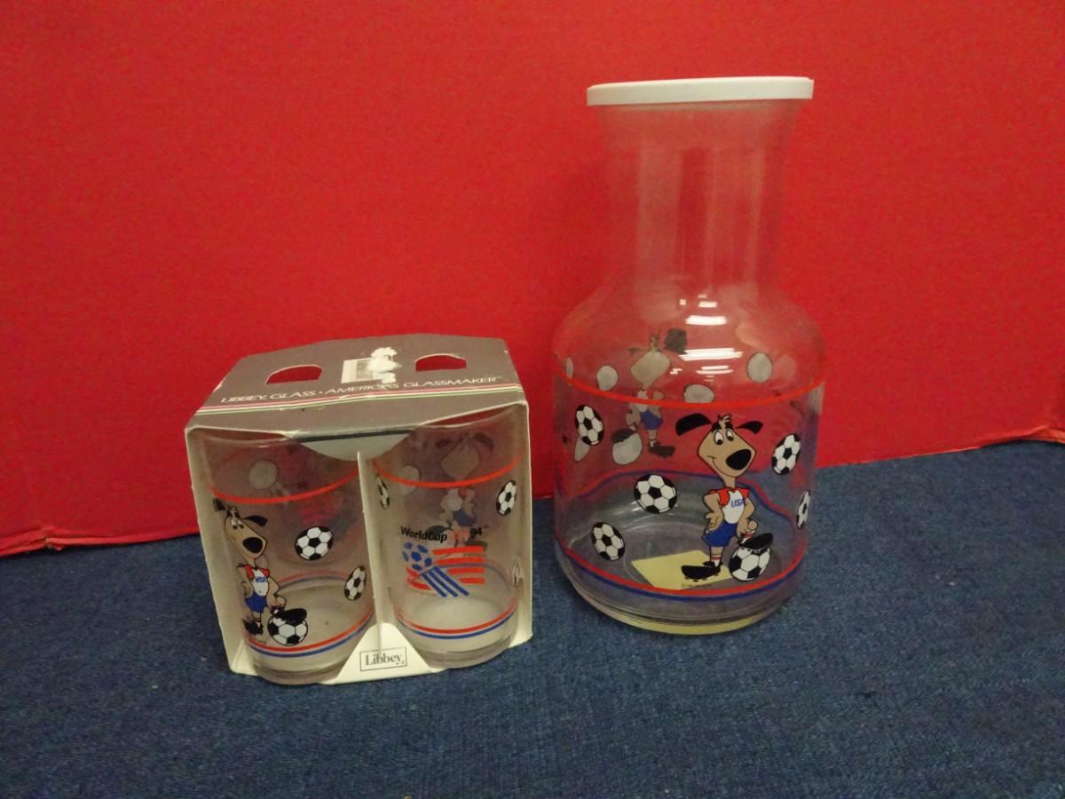 LOT 629.   1984 WORLD CUP  USA LIBBEY JUICE GLASSES AND JUICE CONTAINER