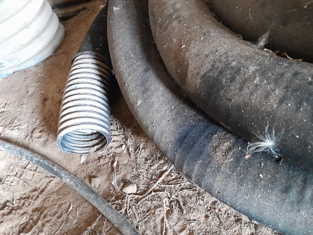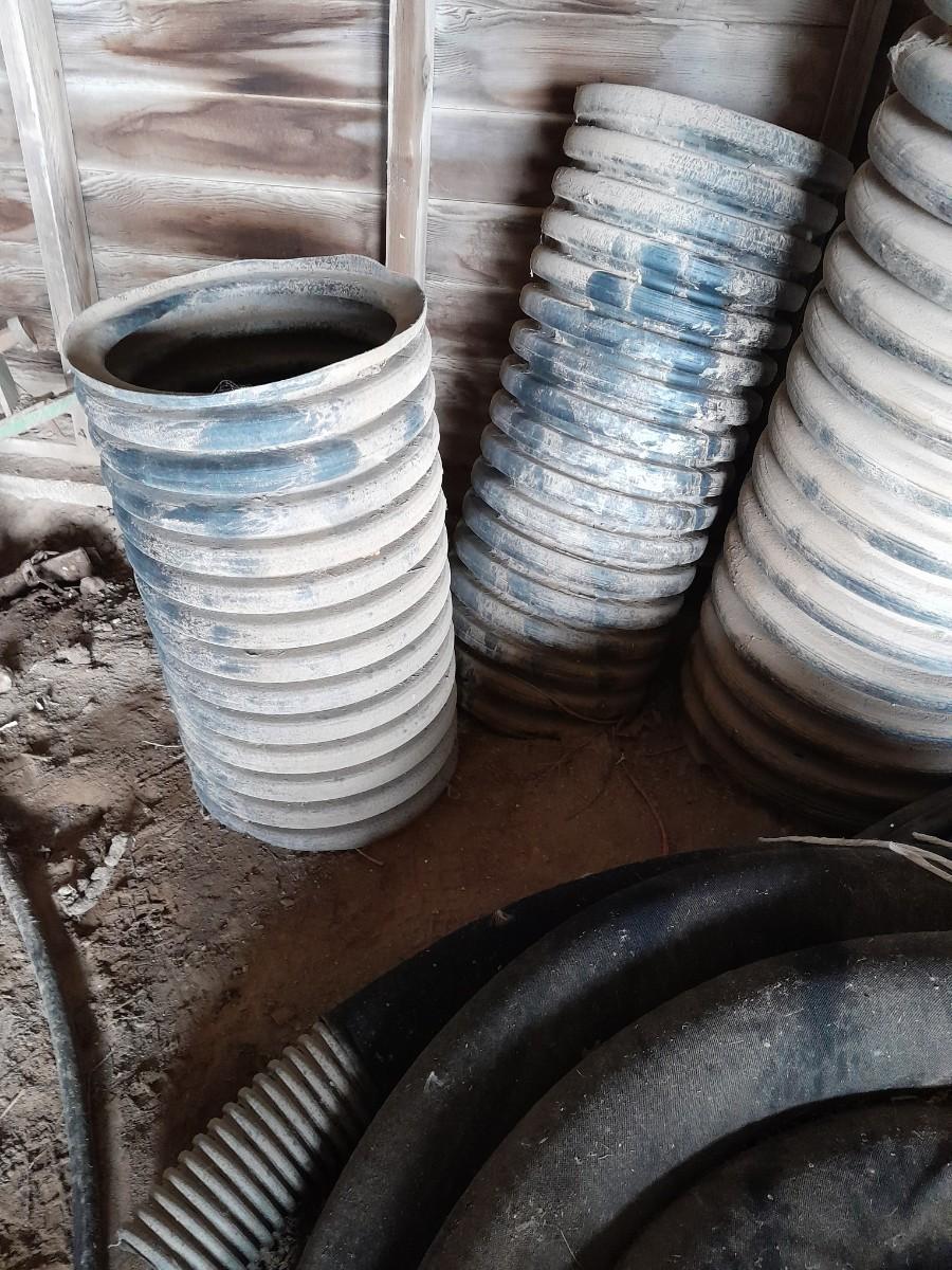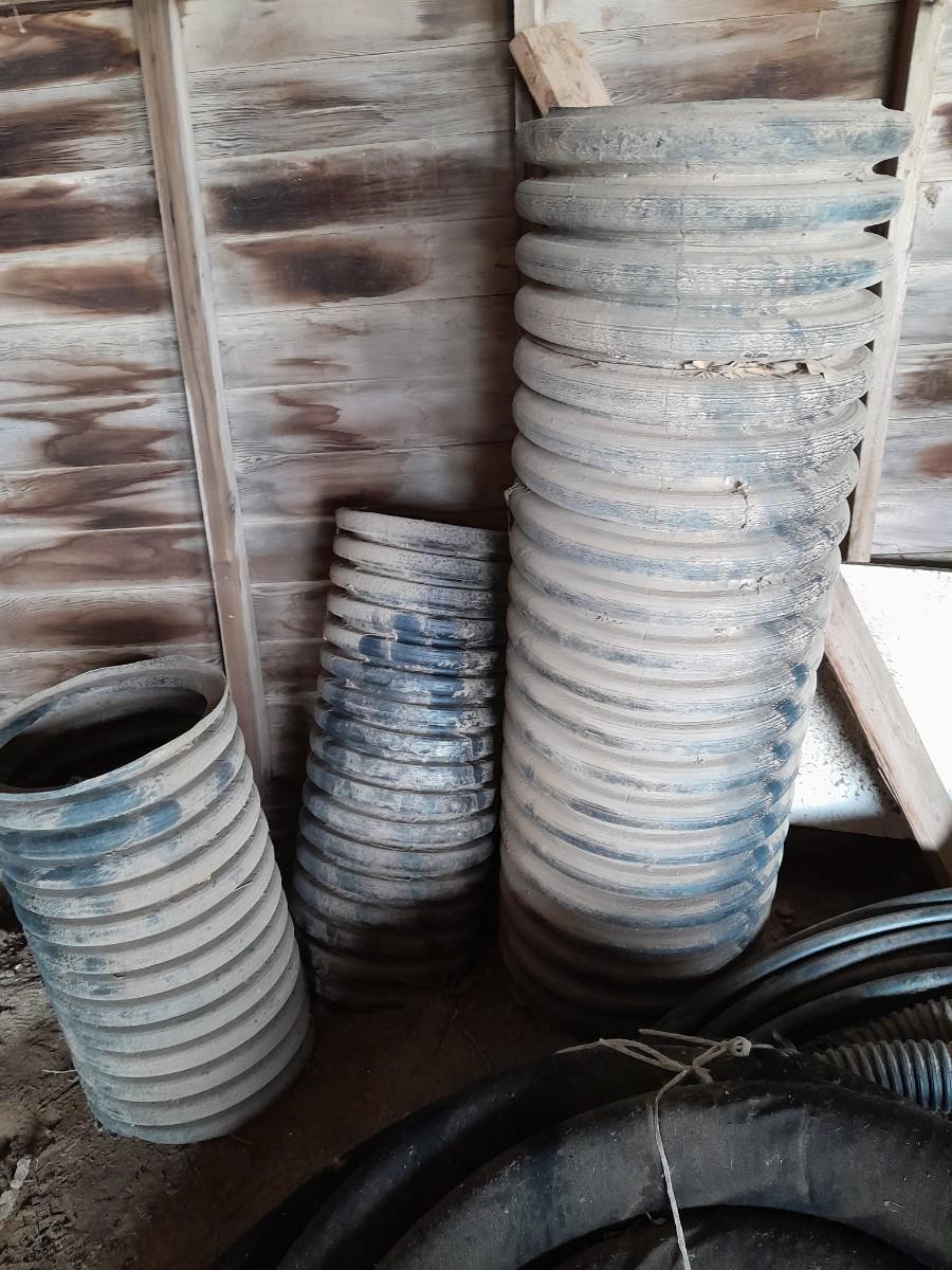 THREE SHORT PLASTIC RIBBED CULVERT / IRRIGATION PIPE AND ROLLS OF IRRIGATION WATER PIPE