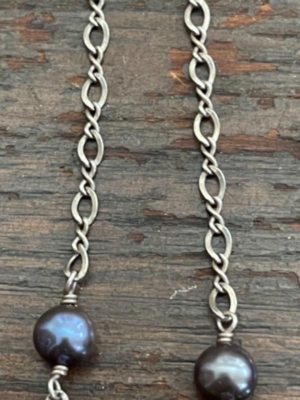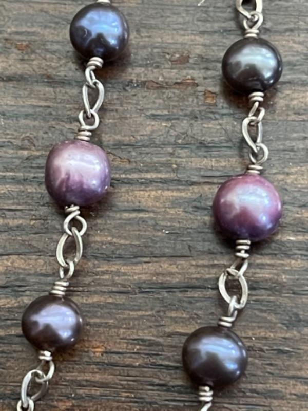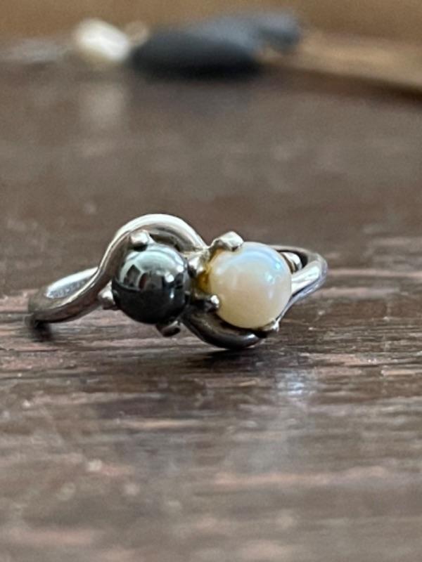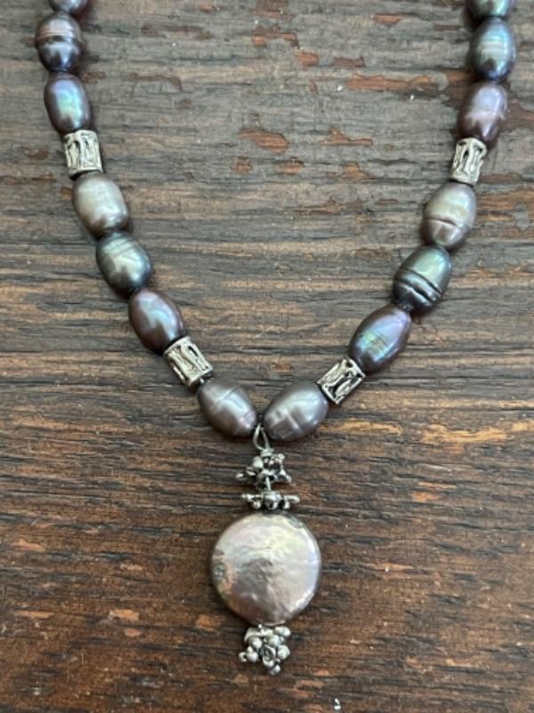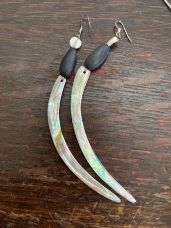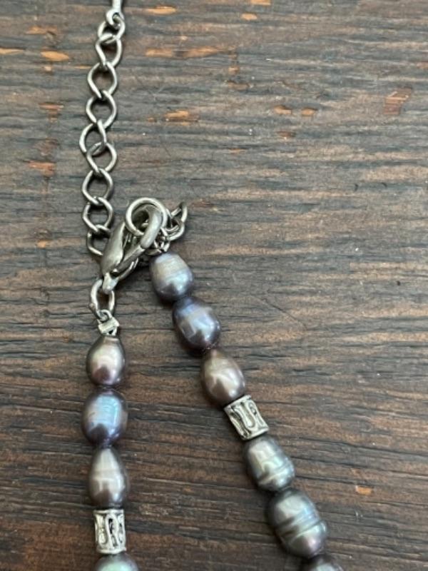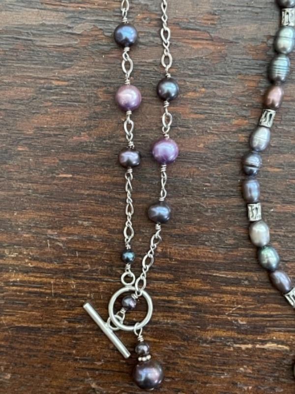 Lot 62LD. Assorted vintage jewelry“”pearls, sterling silver, fused glass, mother of pearl, brass“”4 necklaces, ring (size 7), pair of earrings (mother of pearl), one seahorse brass brooch; one 3-strand beaded chain necklace; one pearl and sterling silver necklace (black/purple pearls); one (black/purple) pearl necklace with pendant; one fused glass pendant necklace with cord; one pair of dangling mother of pearl (abalone) earrings 4” long); one sterling silver and pearls ring (black and white) (size 7)--$85