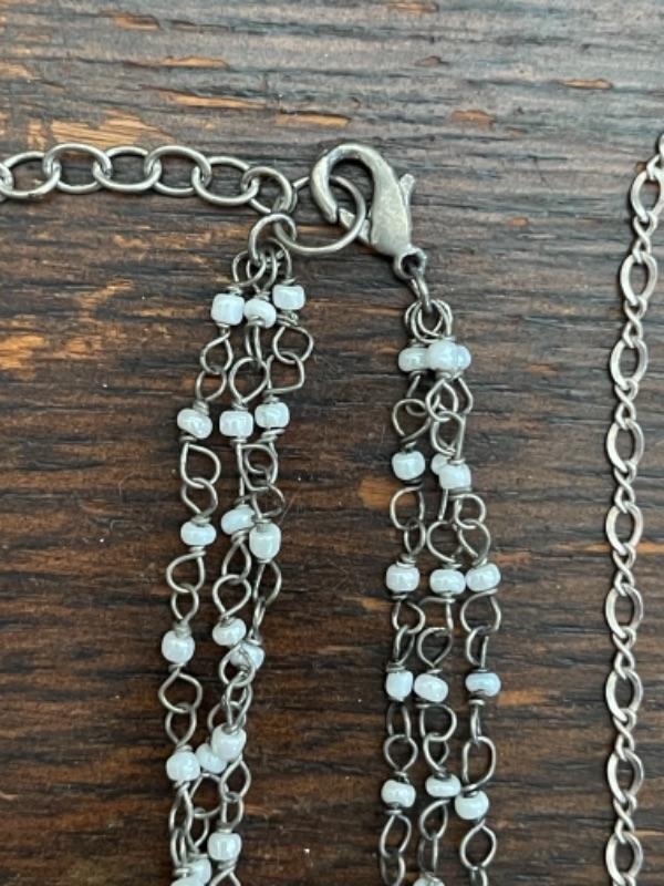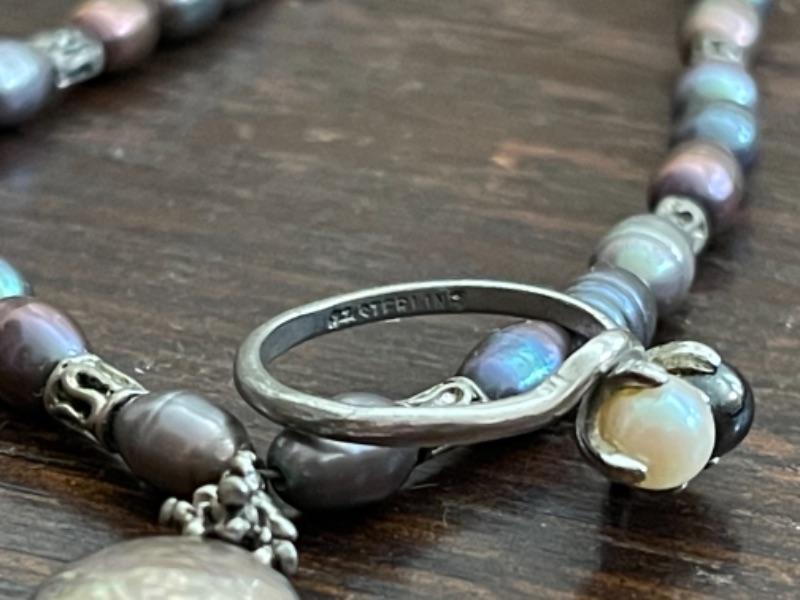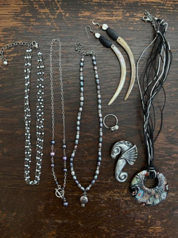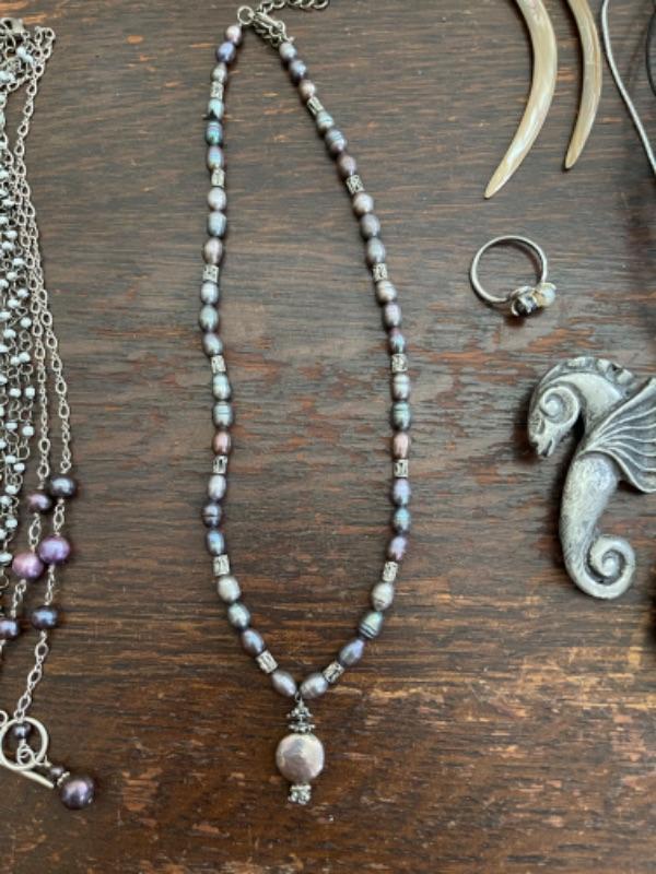 Lot 62LD. Assorted vintage jewelry“”pearls, sterling silver, fused glass, mother of pearl, brass“”4 necklaces, ring (size 7), pair of earrings (mother of pearl), one seahorse brass brooch; one 3-strand beaded chain necklace; one pearl and sterling silver necklace (black/purple pearls); one (black/purple) pearl necklace with pendant; one fused glass pendant necklace with cord; one pair of dangling mother of pearl (abalone) earrings 4” long); one sterling silver and pearls ring (black and white) (size 7)
