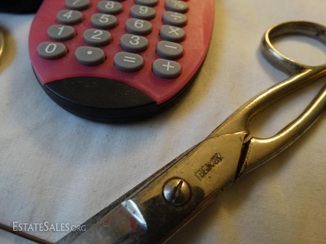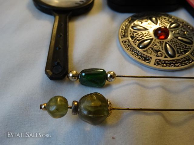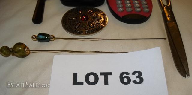 Calculator, compass, magnifying glass, pewter brooch, hat pins, scissors made in Germany.