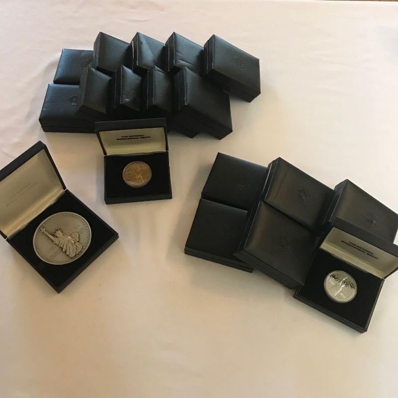 Seventeen 1776 - 1976 Bicentennial Commemorative Medals. Six silver, eleven gold colored and one large silver medal. Some are likely sterling, metals are not verified.