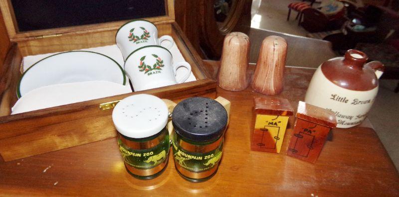 WOODEN BREAD BOX, SALT & PEPPER SHAKERS, LITTLE BROWN CLAY JUG AND 2 CUPS AND SAUCERS IN A WOODEN BOX FROM BRAZIL