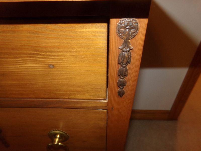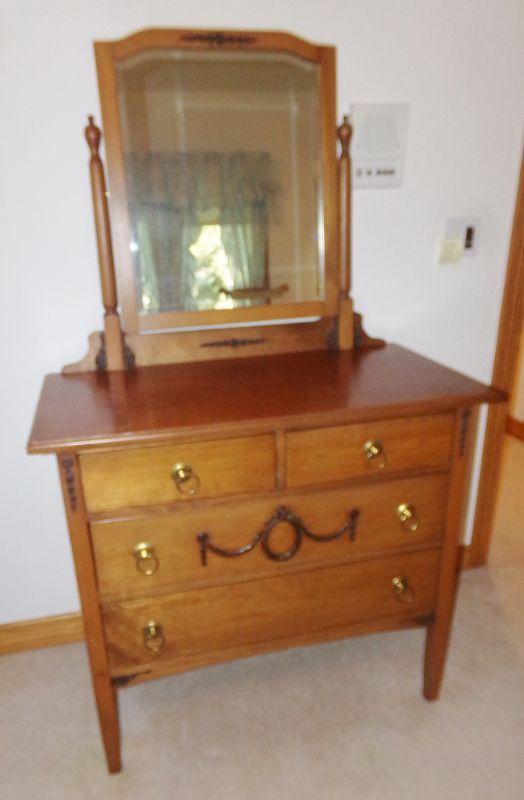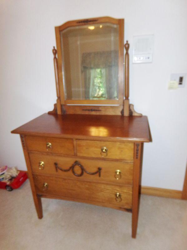 ANTIQUE DRESSER W/BEVELED MIRROR AND ANTIQUE CLAY BABY DISH