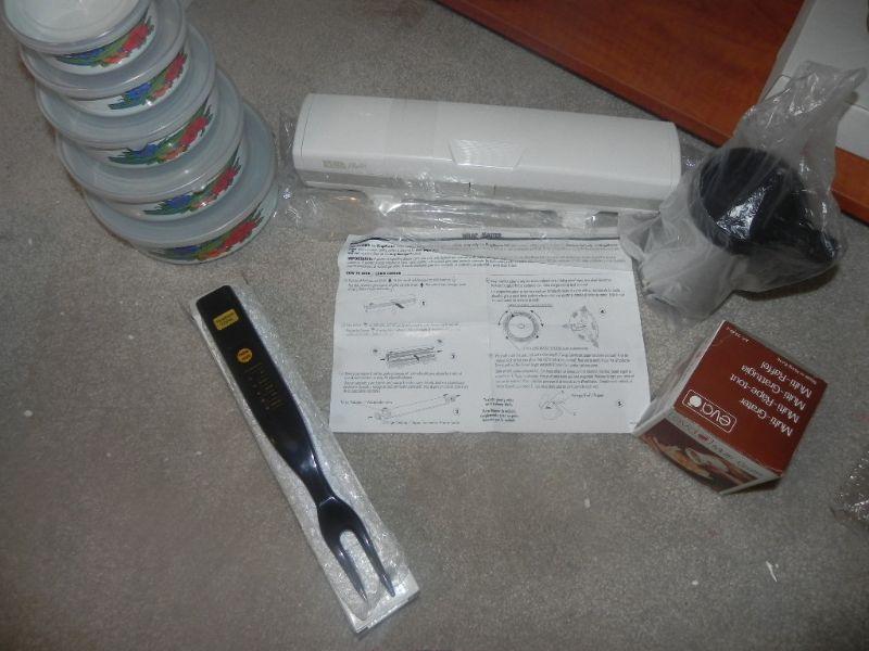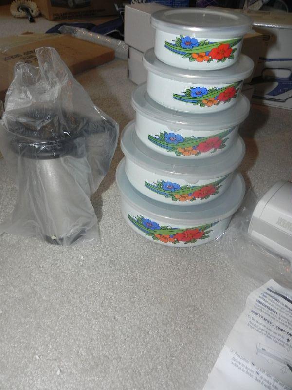 NESTING STORAGE BOWLS WITH LIDS, TRAVEL COFFEE MUG, MULTI GRATER, WRAP MASTER AND TEMPERATURE FORK. ALL ARE NEW
