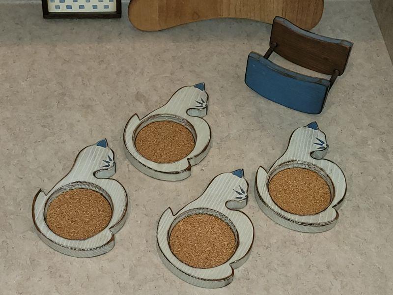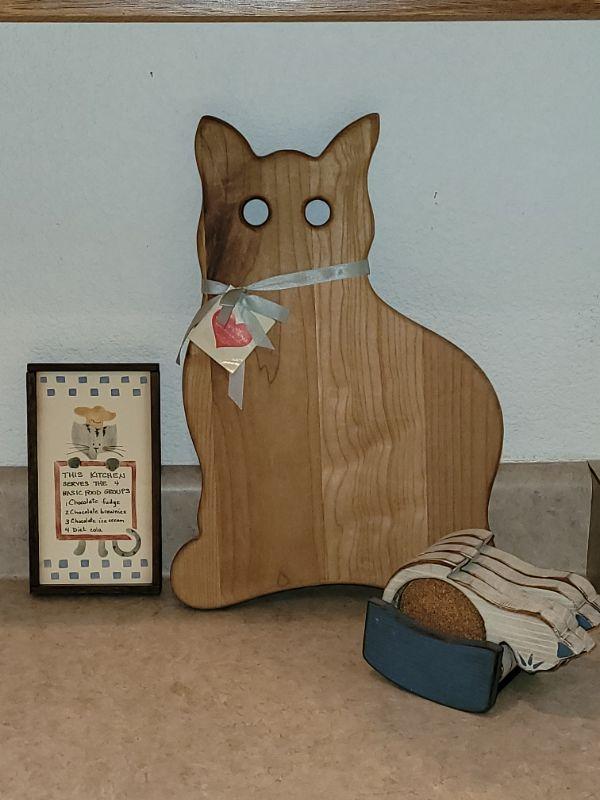 Lot 63: Cat Cutting Board, Cat Coasters and Cat Kitchen Art