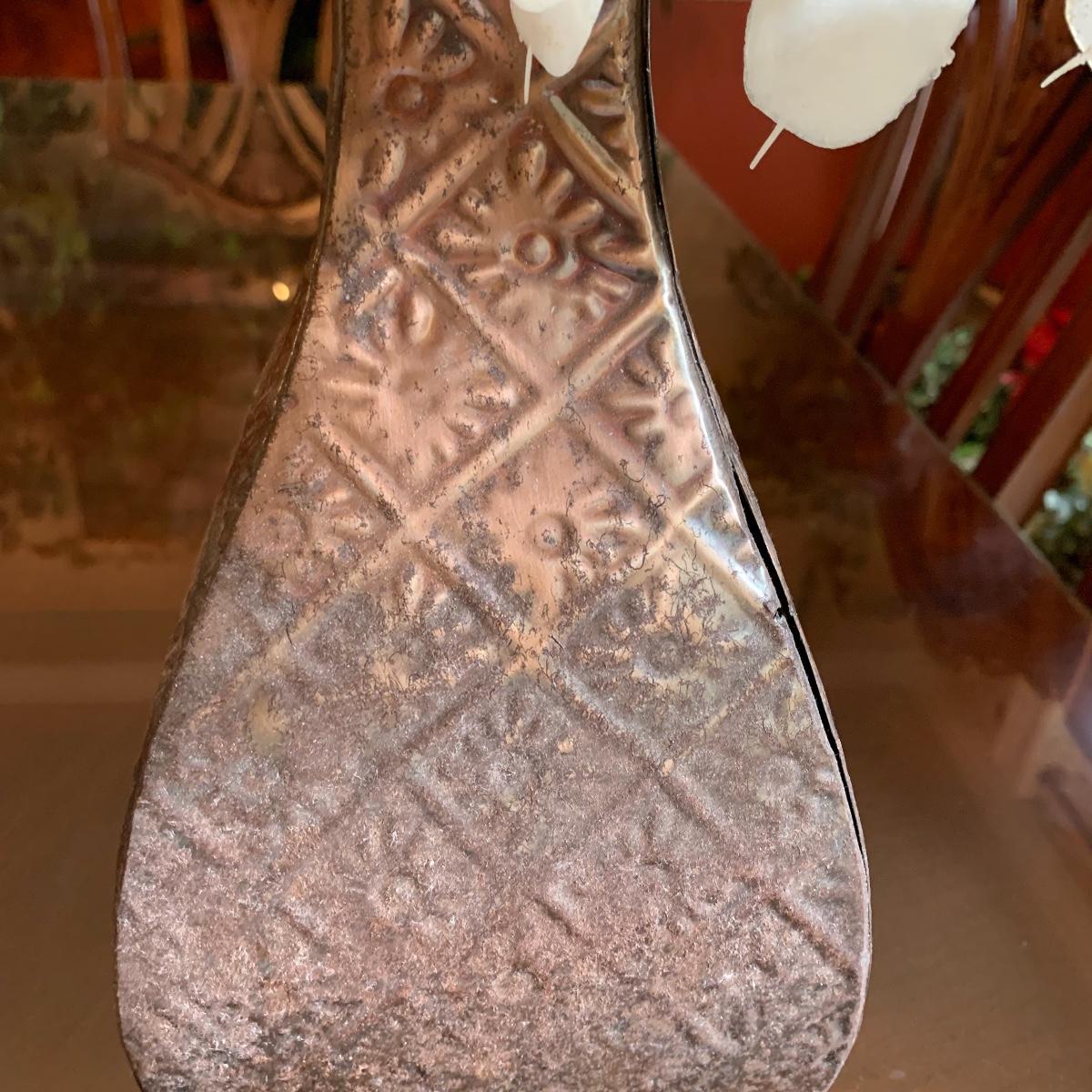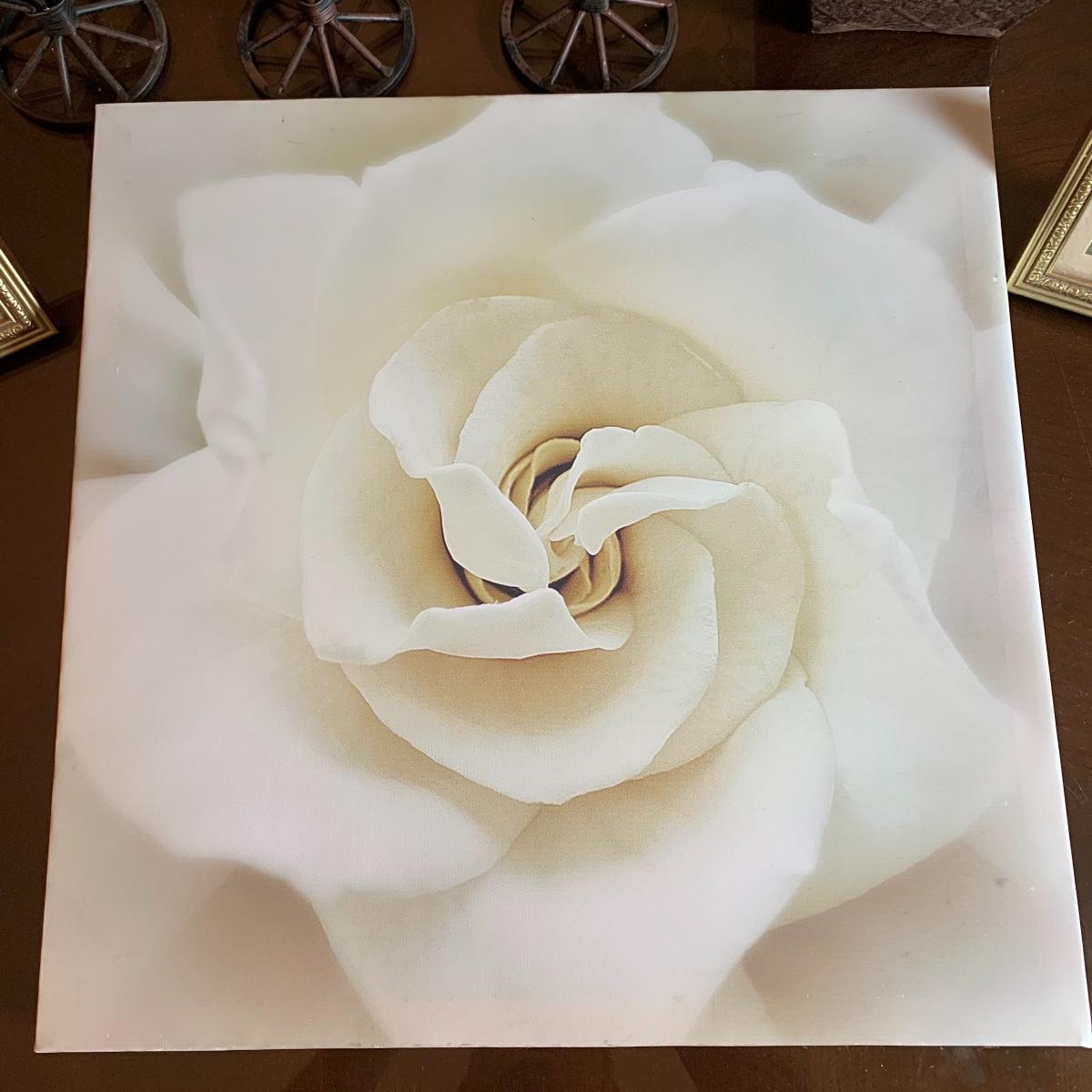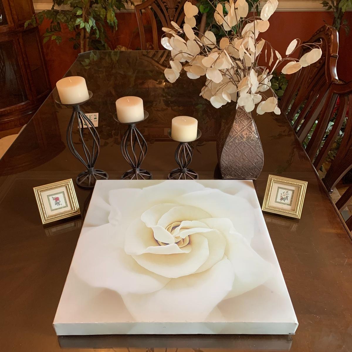 These curtains match this decor perfectly. They are a cream color with a muted stripe pattern, they are also lined and have metal grommets for hanging and are in good condition. Next is a beautiful white rose picture that is printed on canvas and measures 18” square. This lot also includes three metal candle sticks with candles, two little framed flower themed works of art, and a copper colored metal vase with artificial plants. See pics for details.