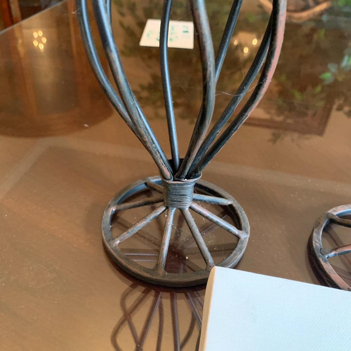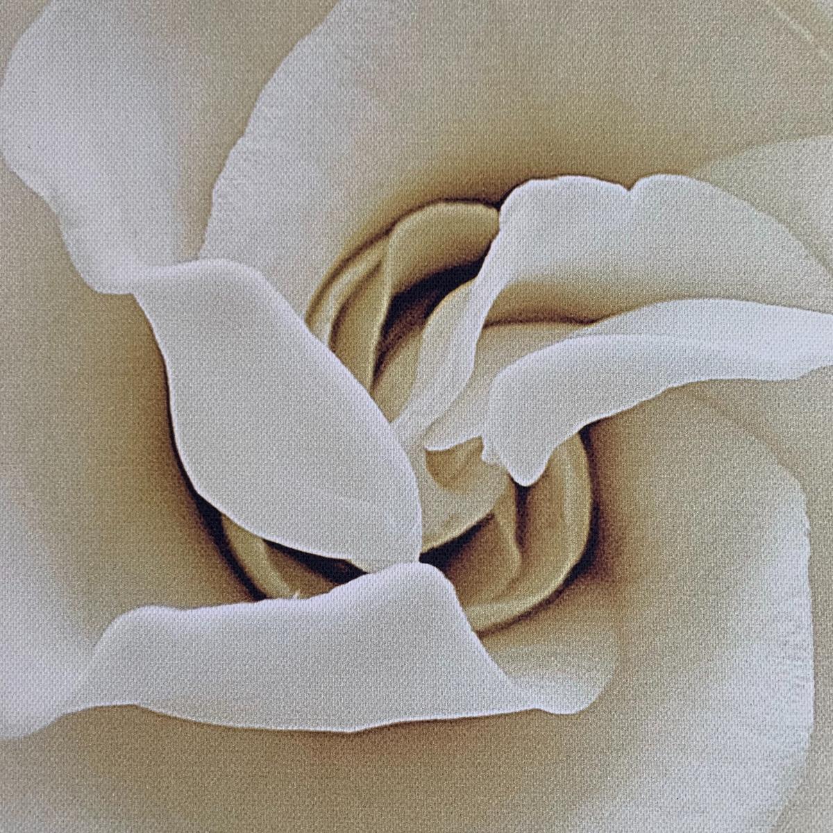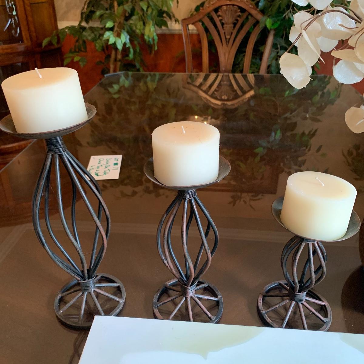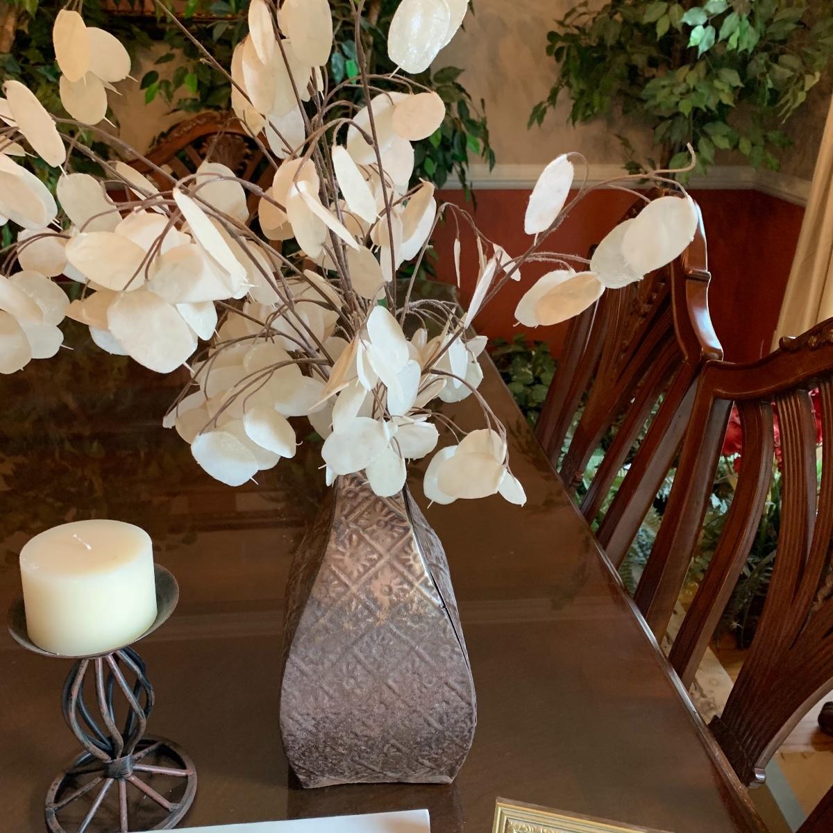 These curtains match this decor perfectly. They are a cream color with a muted stripe pattern, they are also lined and have metal grommets for hanging and are in good condition. Next is a beautiful white rose picture that is printed on canvas and measures 18” square. This lot also includes three metal candle sticks with candles, two little framed flower themed works of art, and a copper colored metal vase with artificial plants. See pics for details.